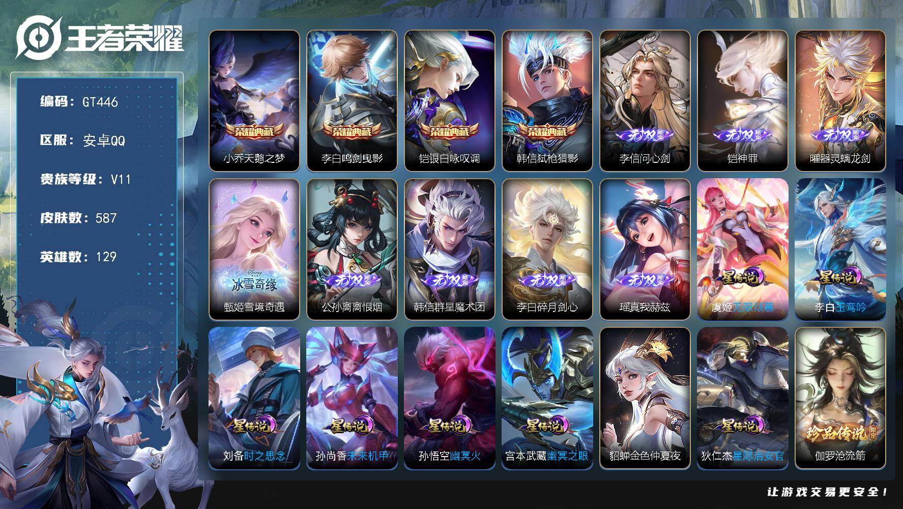 贵族8/皮肤289/典藏2/传说19/史诗94/英雄128/元歌全皮/戈娅全皮/