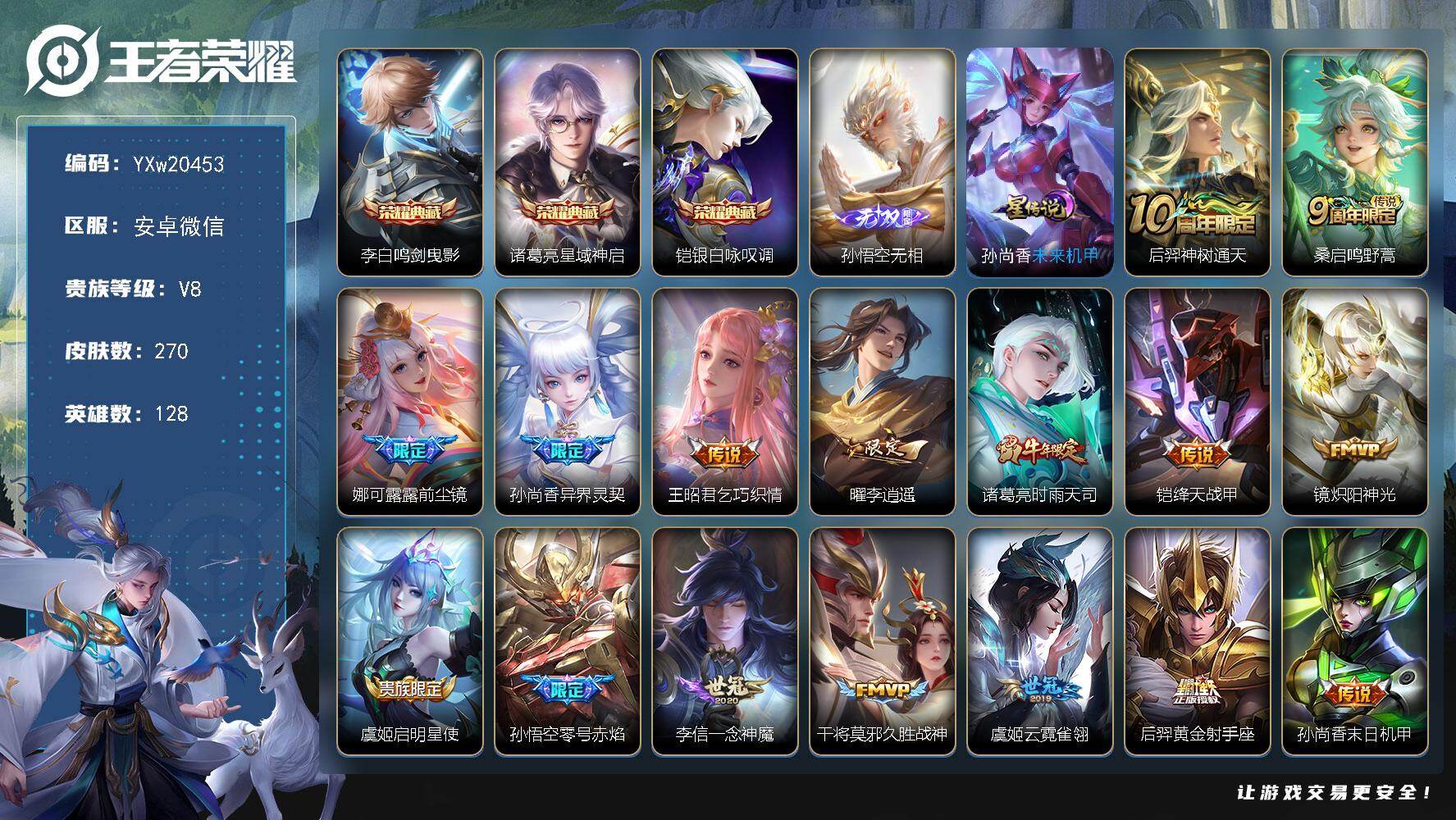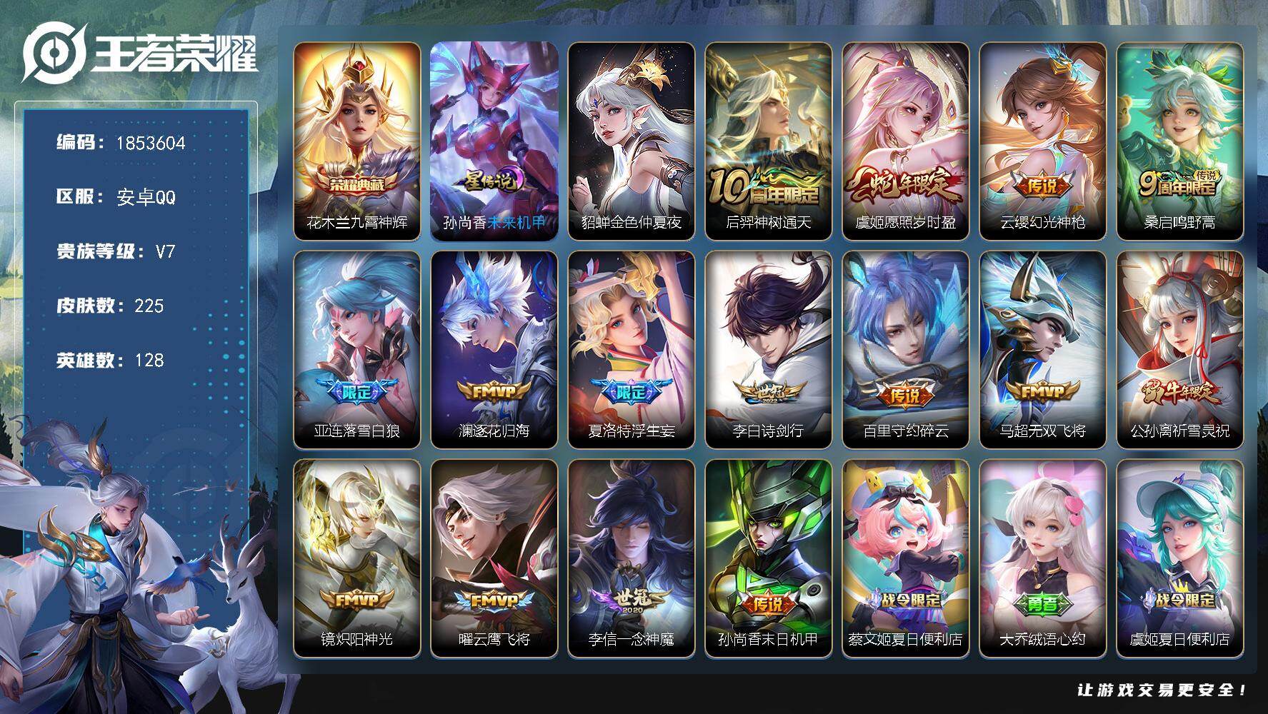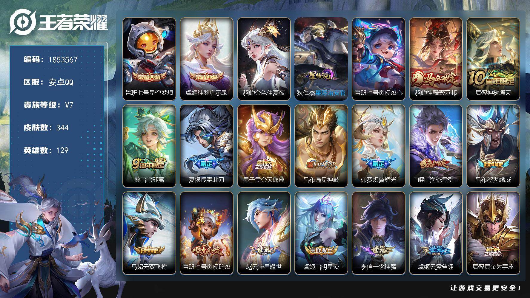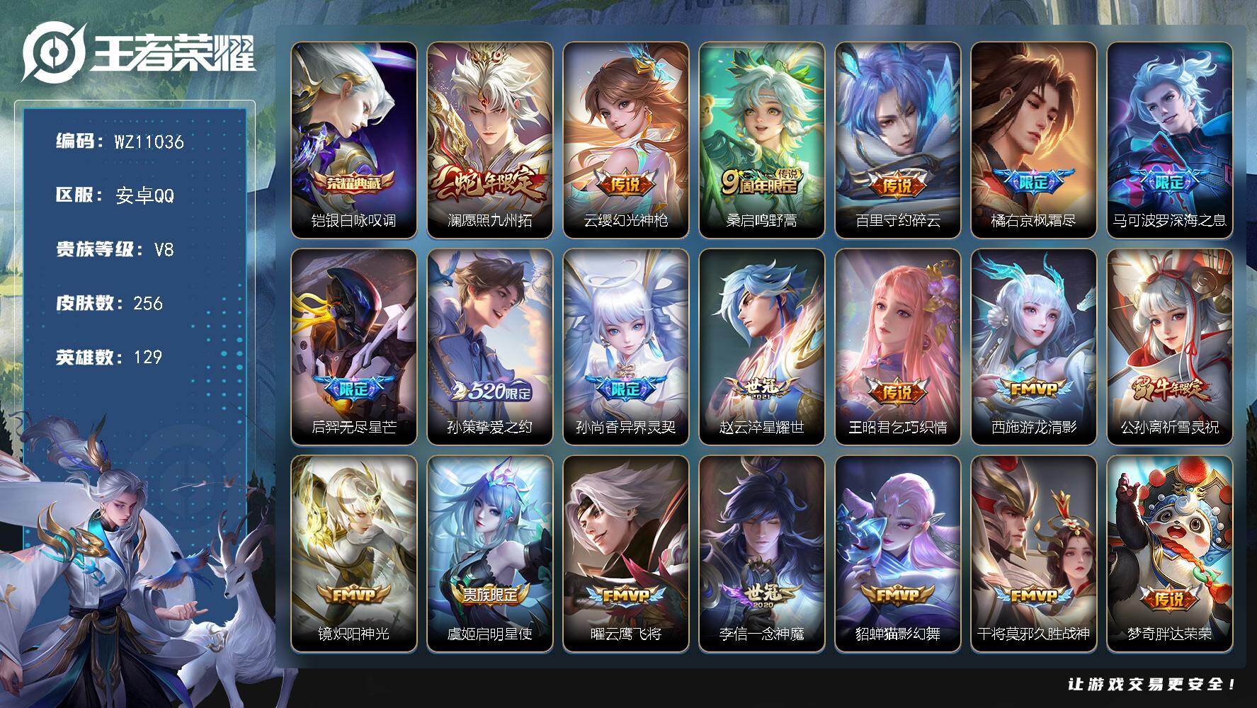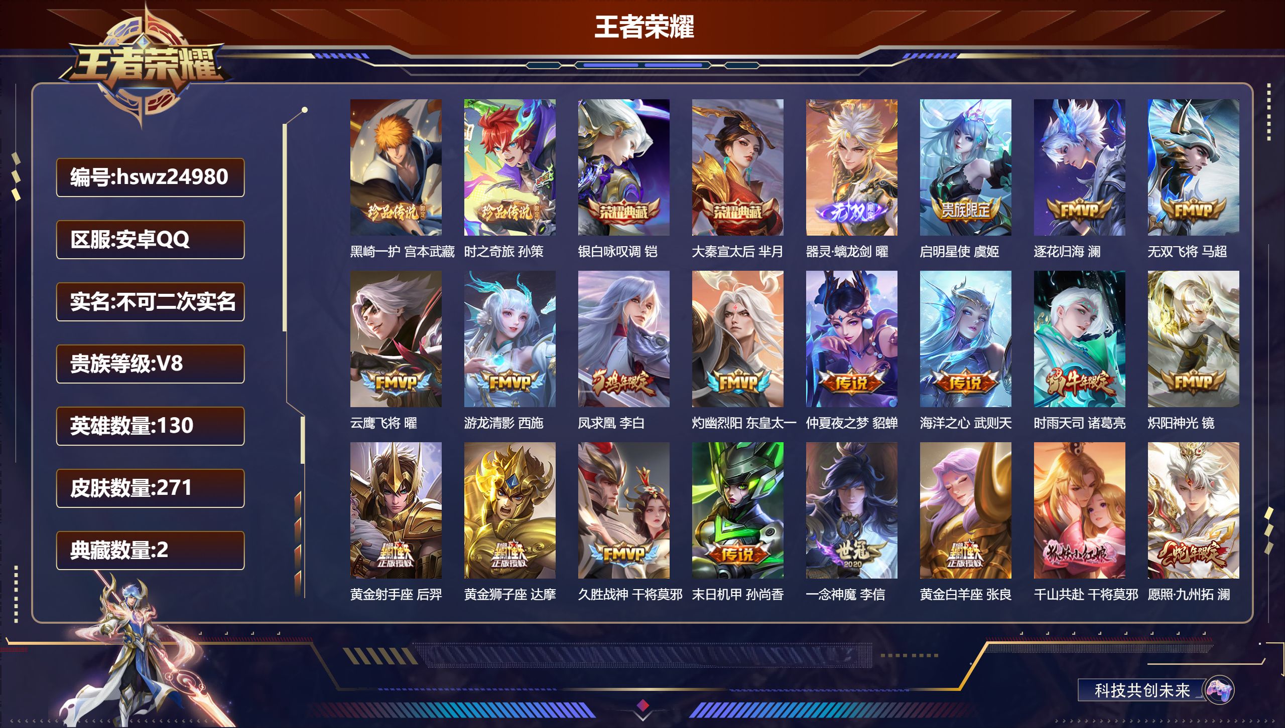 安卓QQ/传奇王者/271皮肤/130英雄/2典藏/0珍品无双/1无双/2珍品传