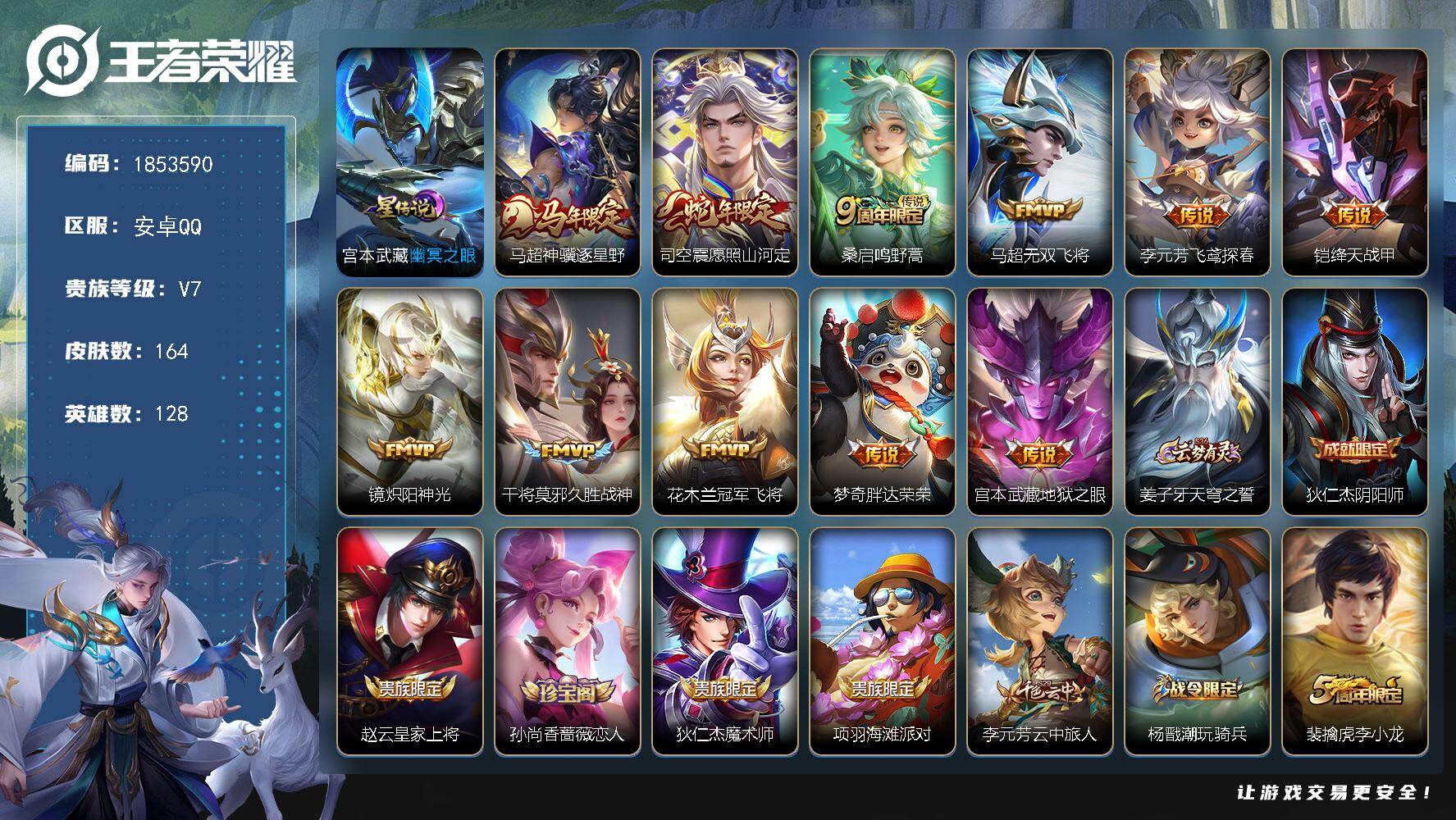【W6695】安卓Q区-可二次-贵5-126英雄-130皮肤-3传说-30史诗