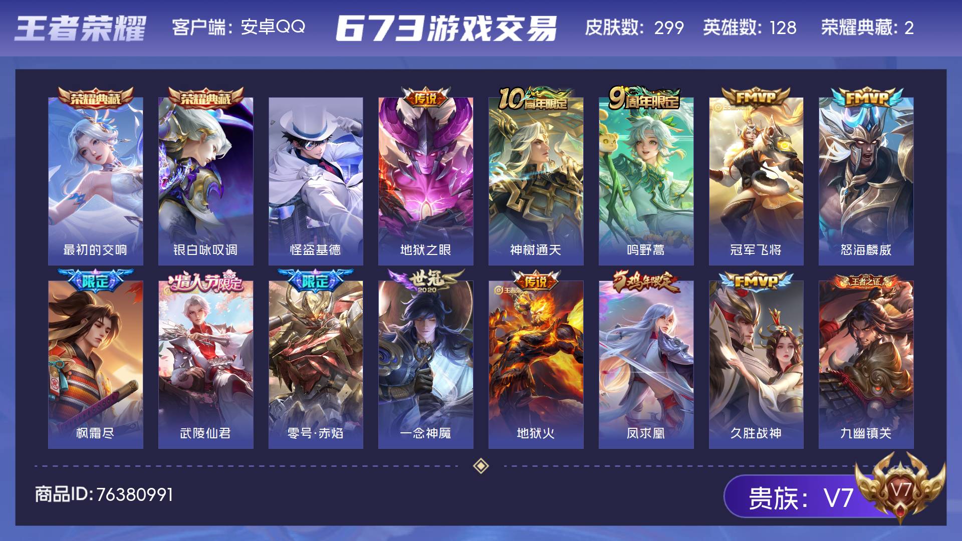 V7 皮肤299 英雄128 无双王者 荣耀典藏2 珍品传说1 星传说2 传说12