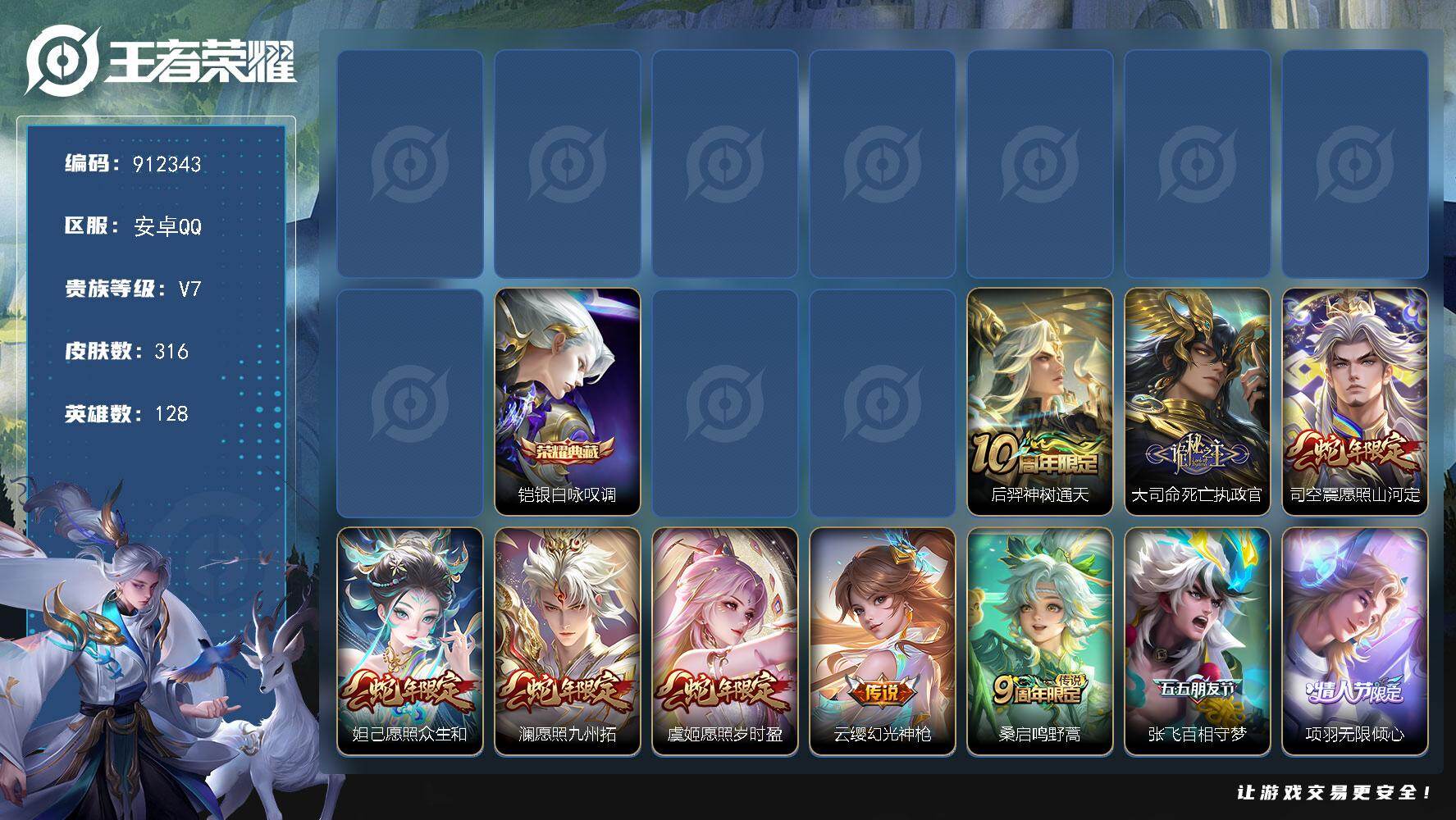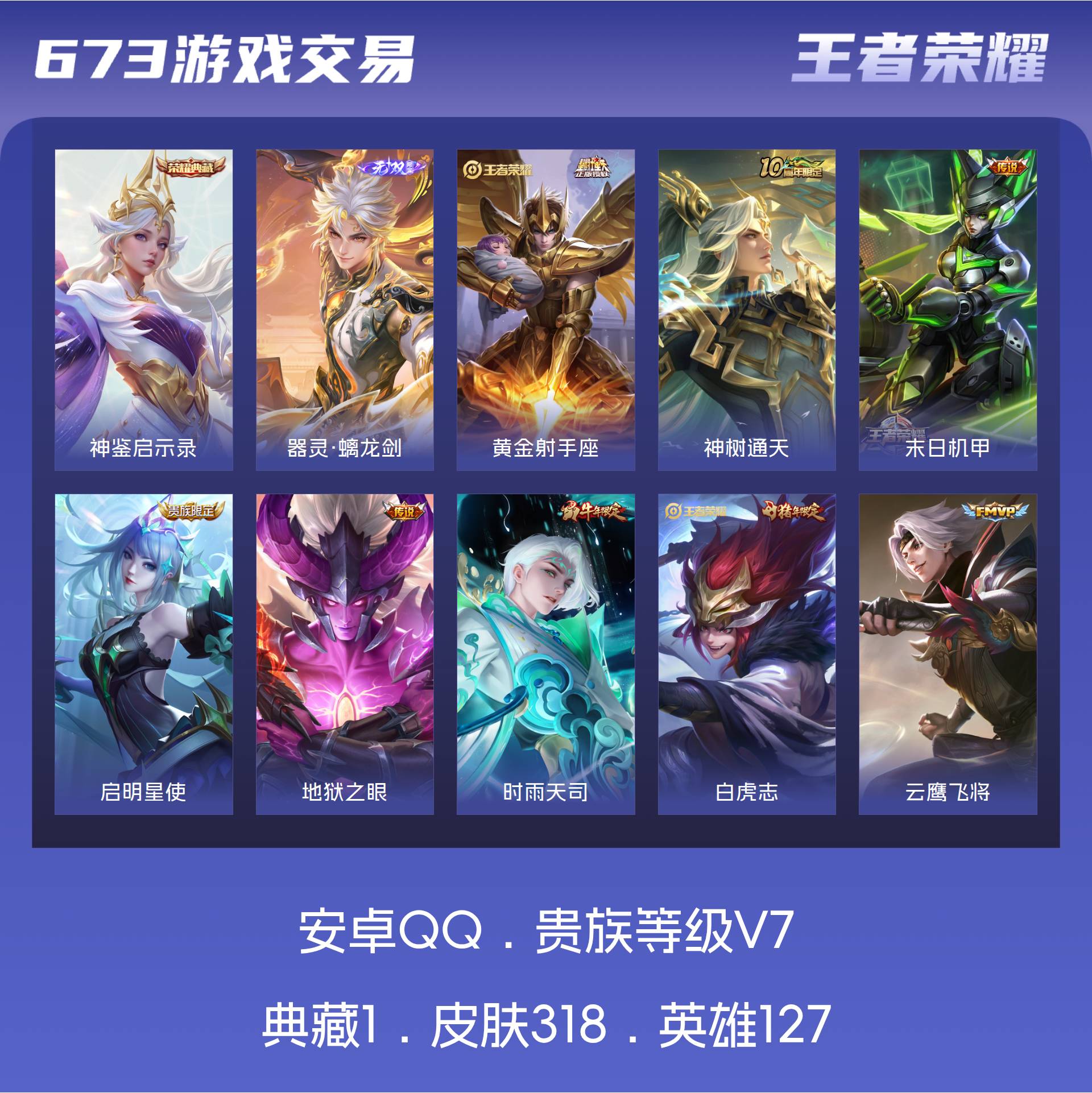 V7-最强王者段位-127英雄-318皮肤-1典藏皮肤-1无双-15传说-92史诗 【英雄全皮】:孙权全皮,钟馗全皮 【荣耀典藏】:虞姬神鉴启示录 【无双皮肤】:曜器灵螭龙剑