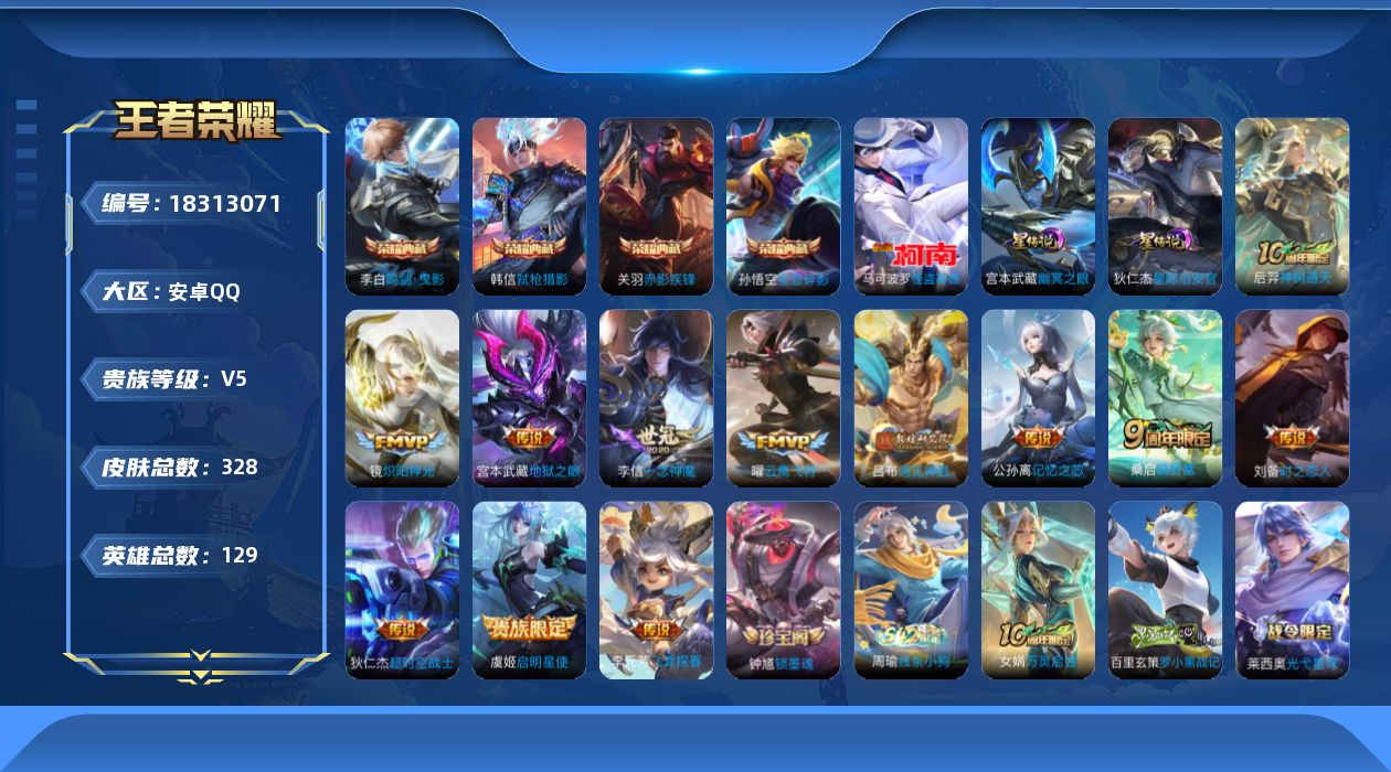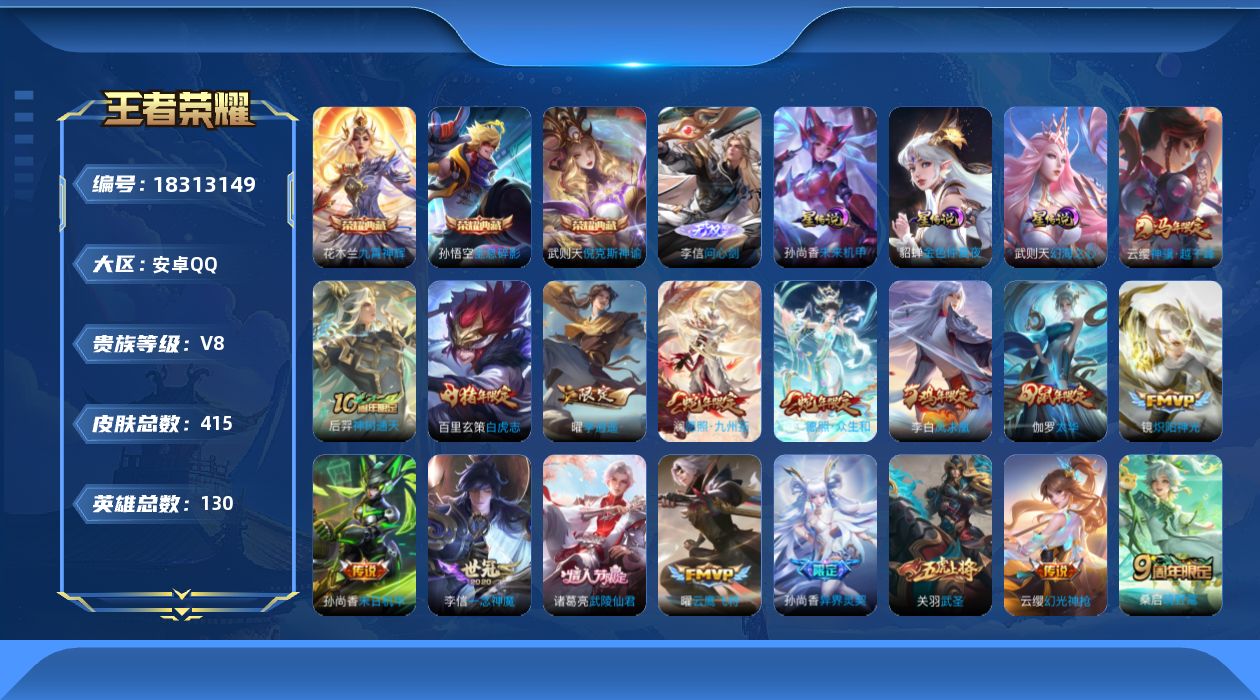 安卓QQ/非凡王者/552皮肤/129英雄/9典藏/0珍品无双/3无双/4珍品传