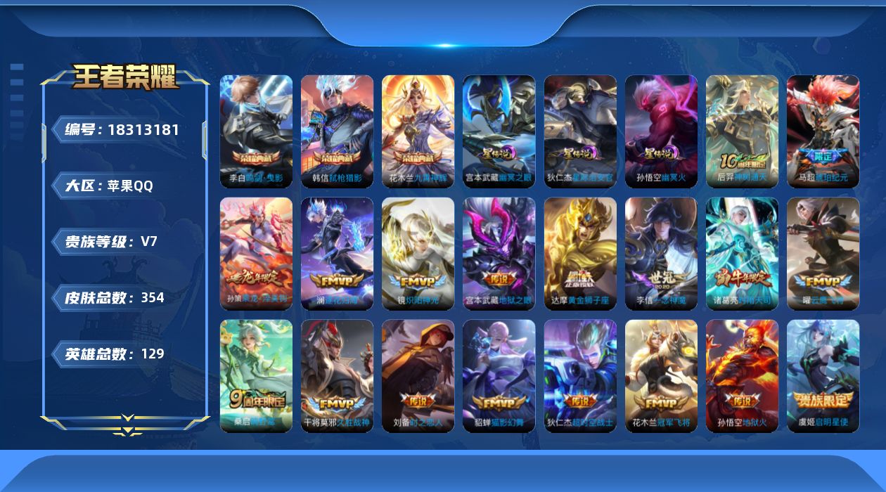 苹果QQ/最强王者/365皮肤/128英雄/2典藏/0珍品无双/3无双/1珍品传