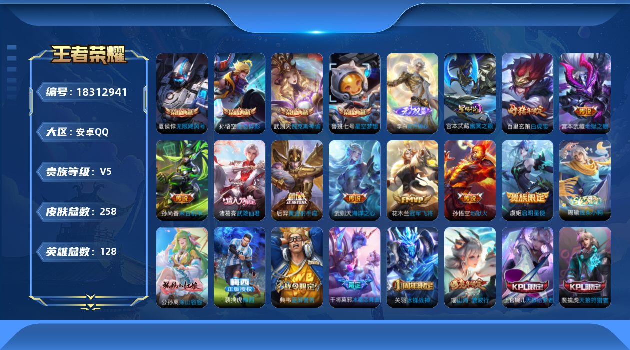 安卓Q-V6-至尊星耀IV段位-128英雄-188皮肤-1典藏皮肤-10传说-