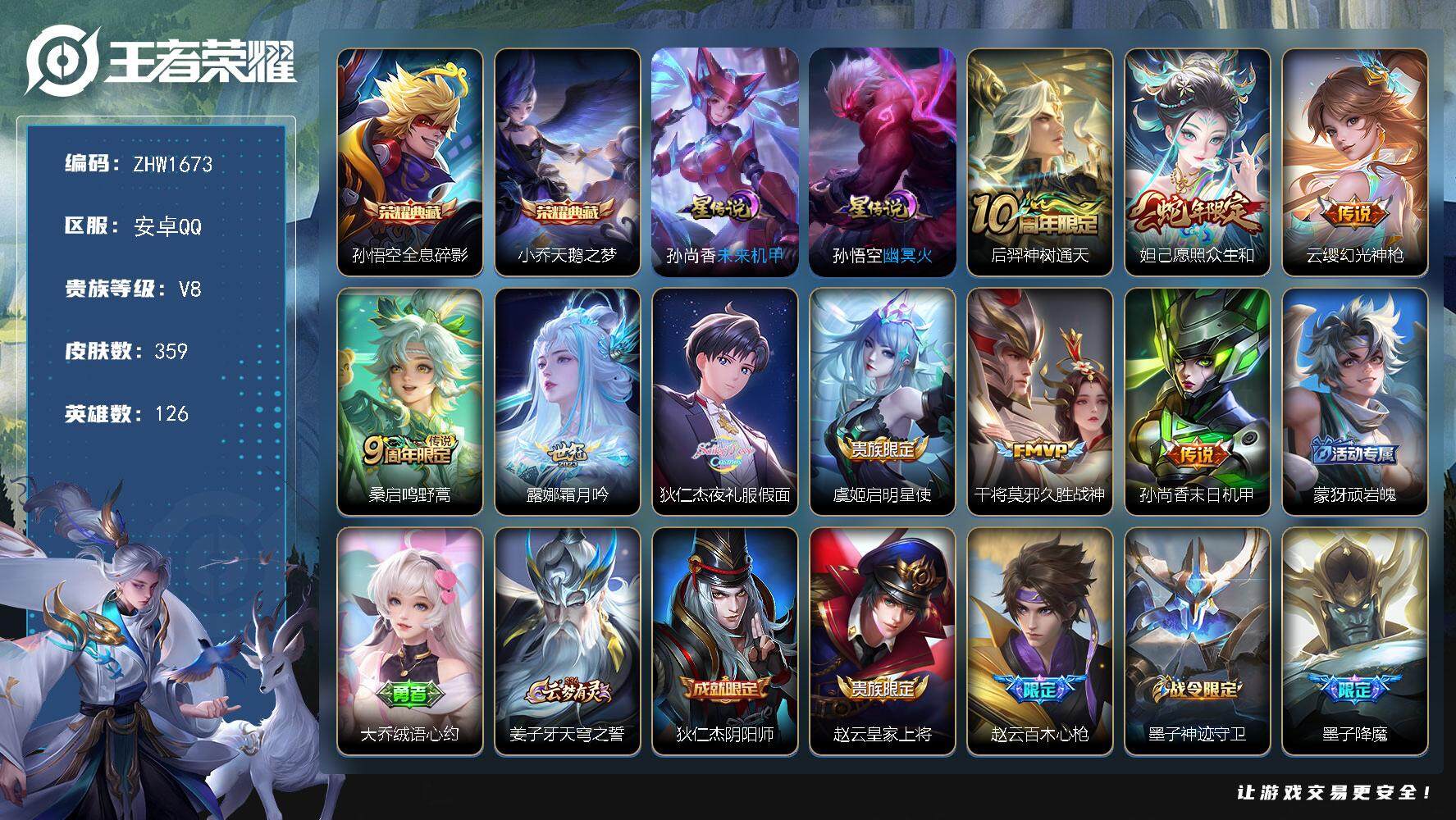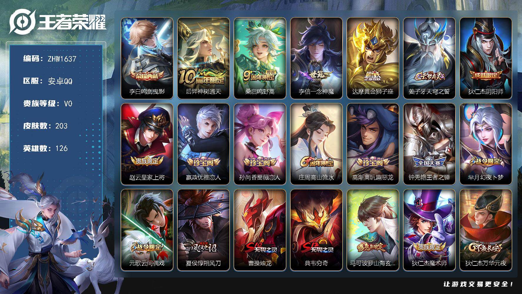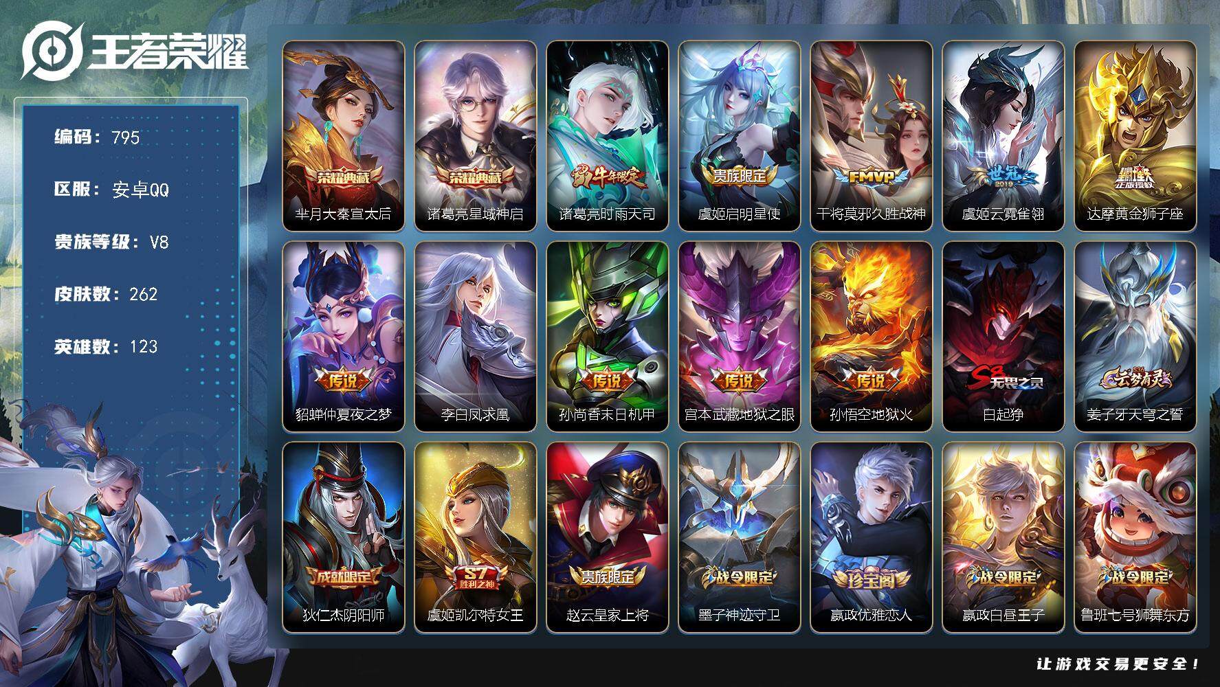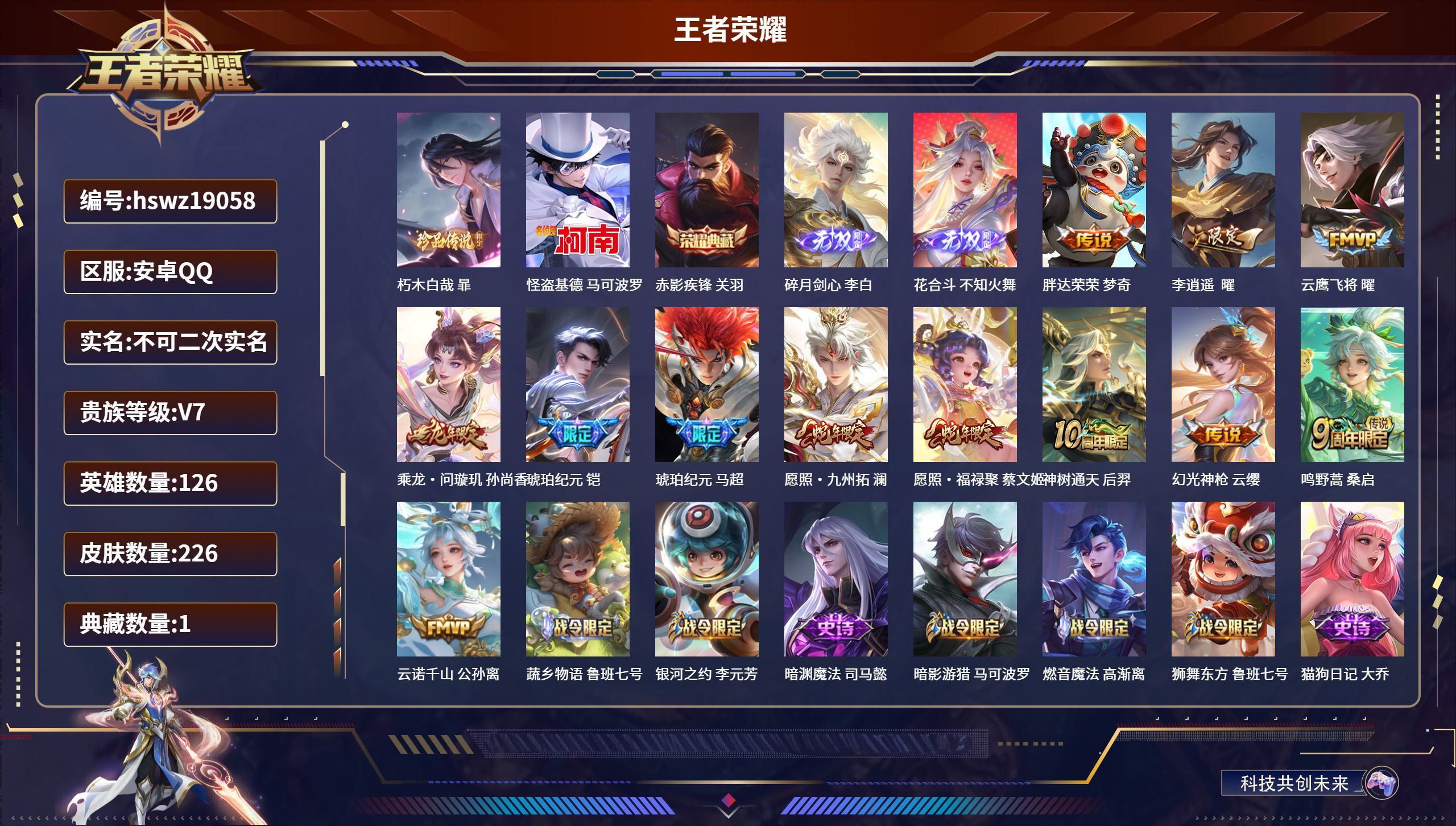 安卓QQ/绝世王者/226皮肤/126英雄/1典藏/0珍品无双/2无双/2珍品传说/12传说/59史