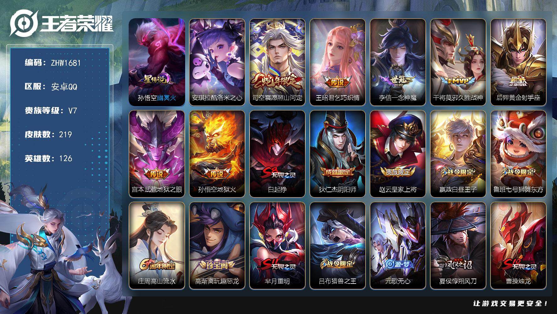 【店主推荐捡漏号!可直接换绑】安卓Q-V7-最强王者段位-126英雄-219皮肤-1珍品传说-7传说-52史诗