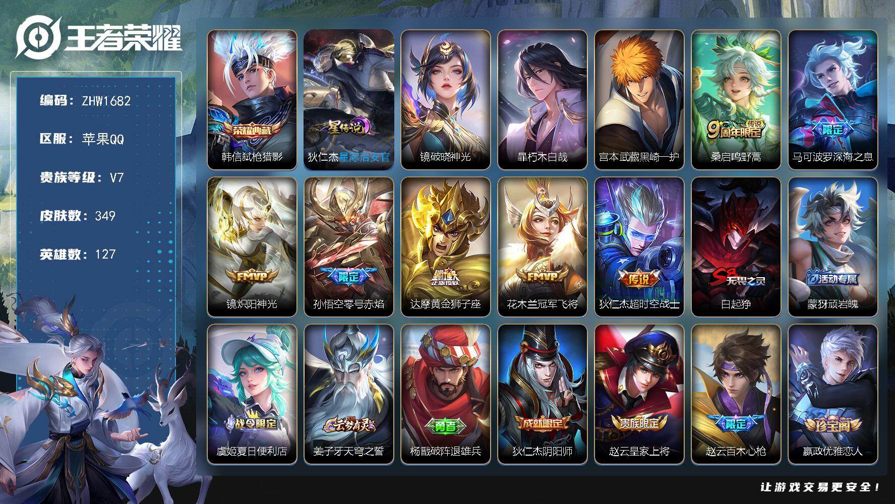 【店主推荐捡漏号!可直接换绑】苹果Q-V7-最强王者段位-127英雄-349皮肤-1典藏皮肤-2珍品传说-7传说-91史诗