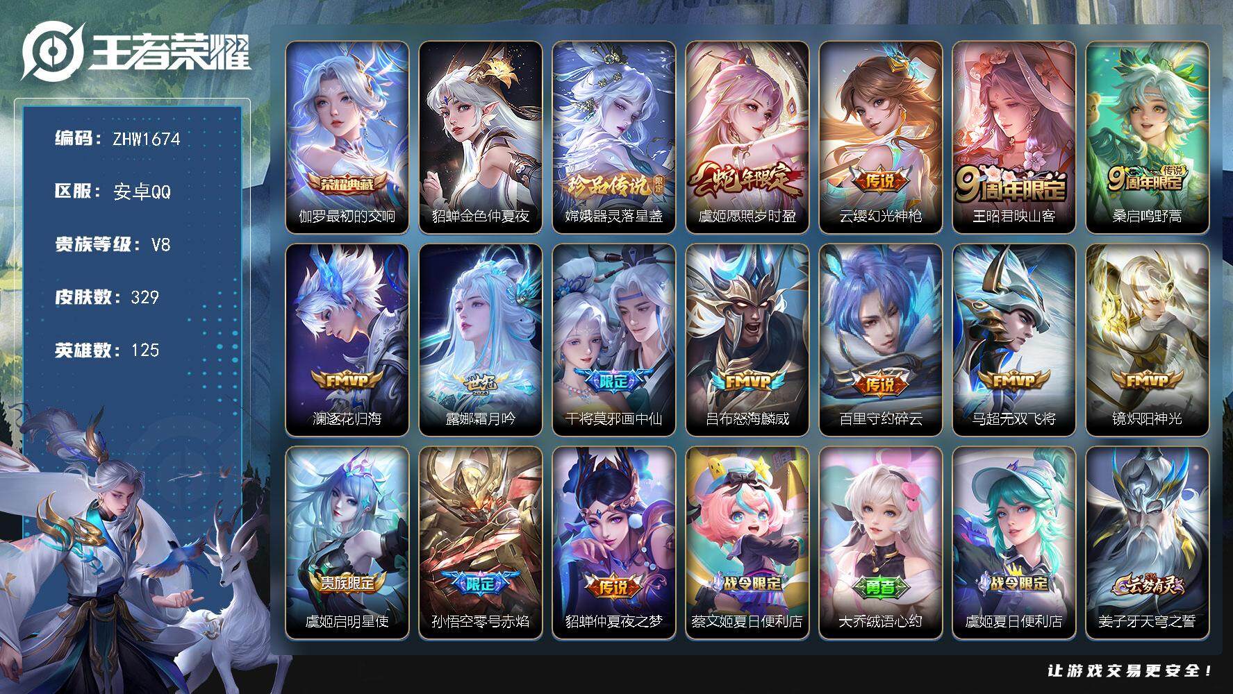 可二次【店主推荐捡漏号!可直接换绑】安卓Q-V8-永恒钻石III段位-125英雄-329皮肤-1典藏皮肤-1珍品传说-1星传说-14传说-96史诗