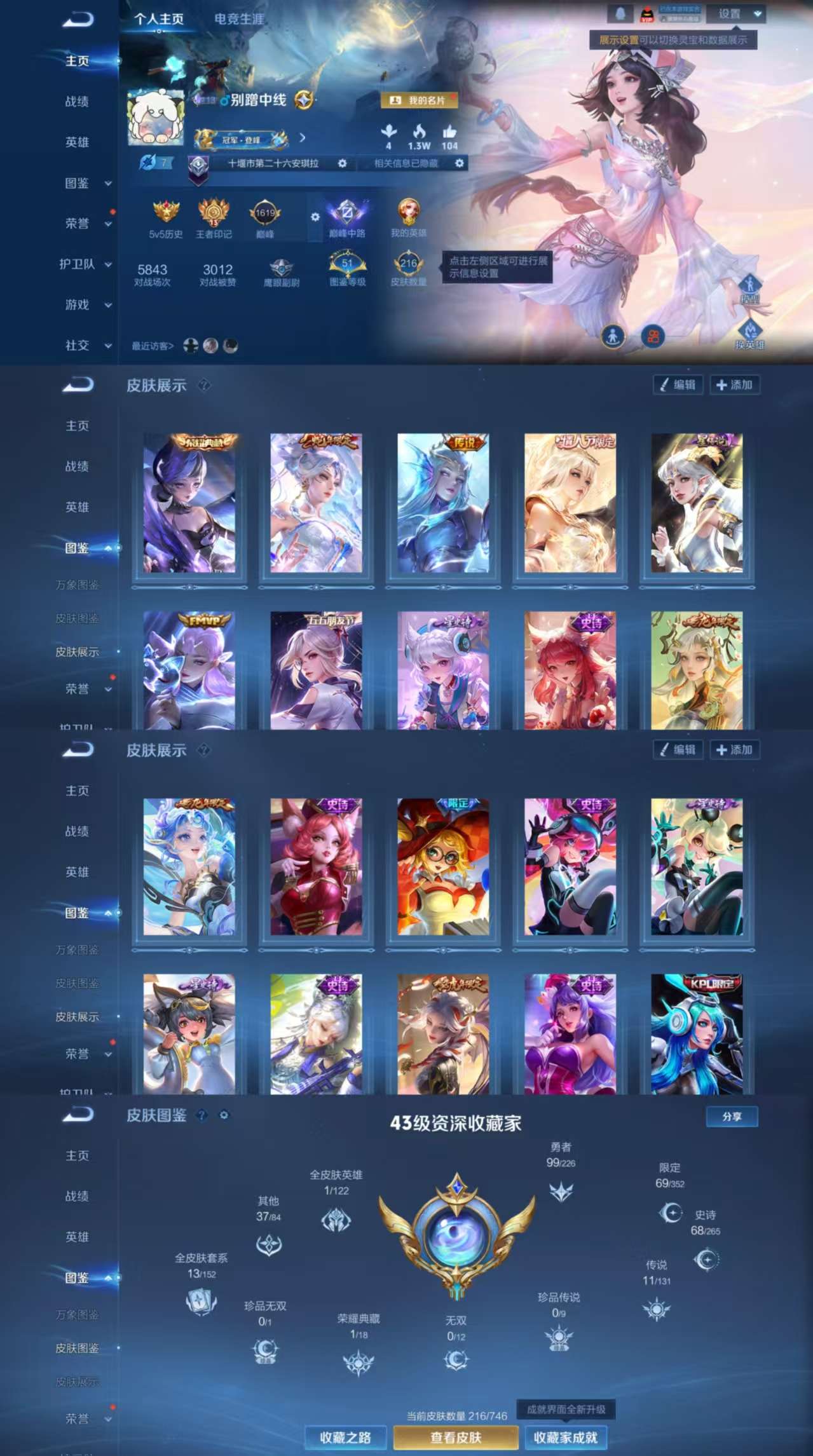 贵族5 传说皮肤3 史诗皮肤38 皮肤数量158