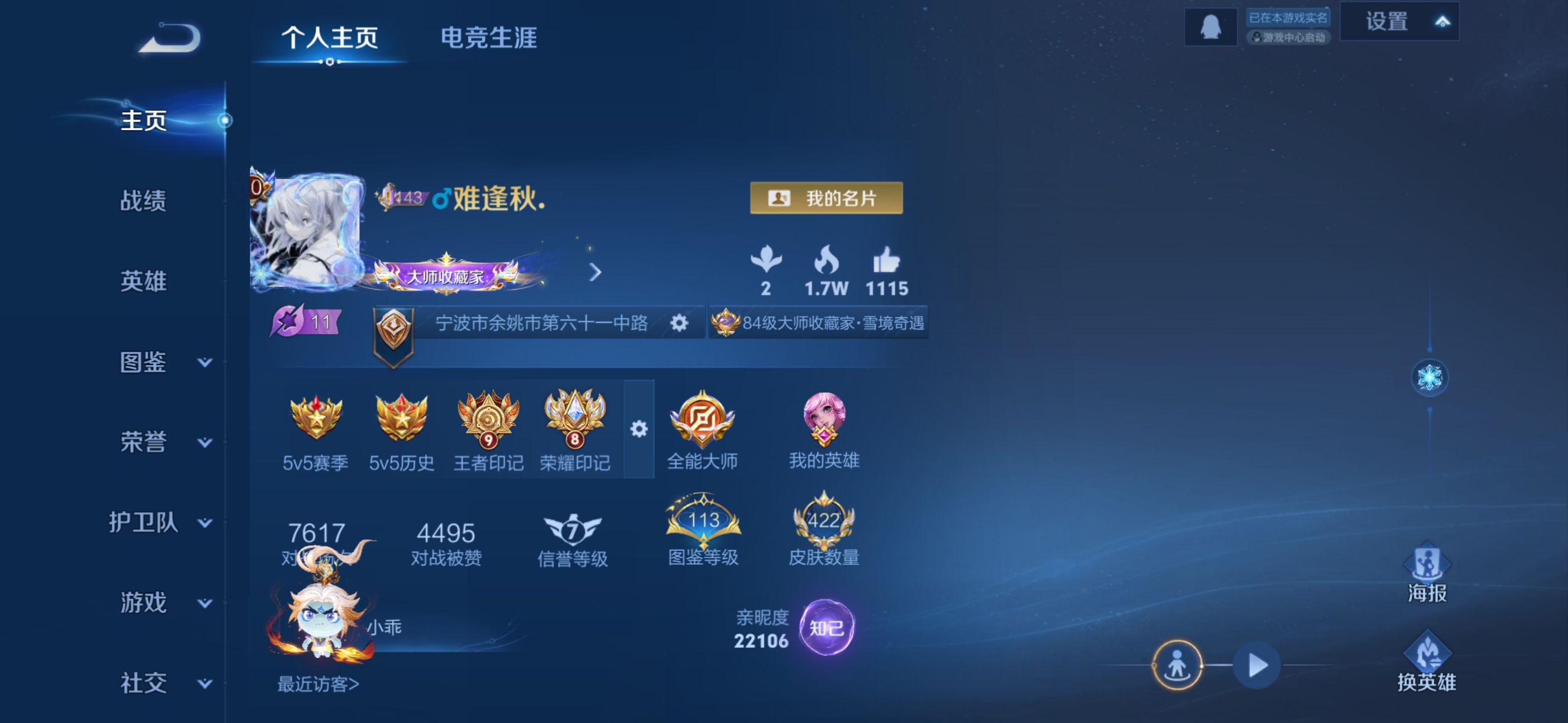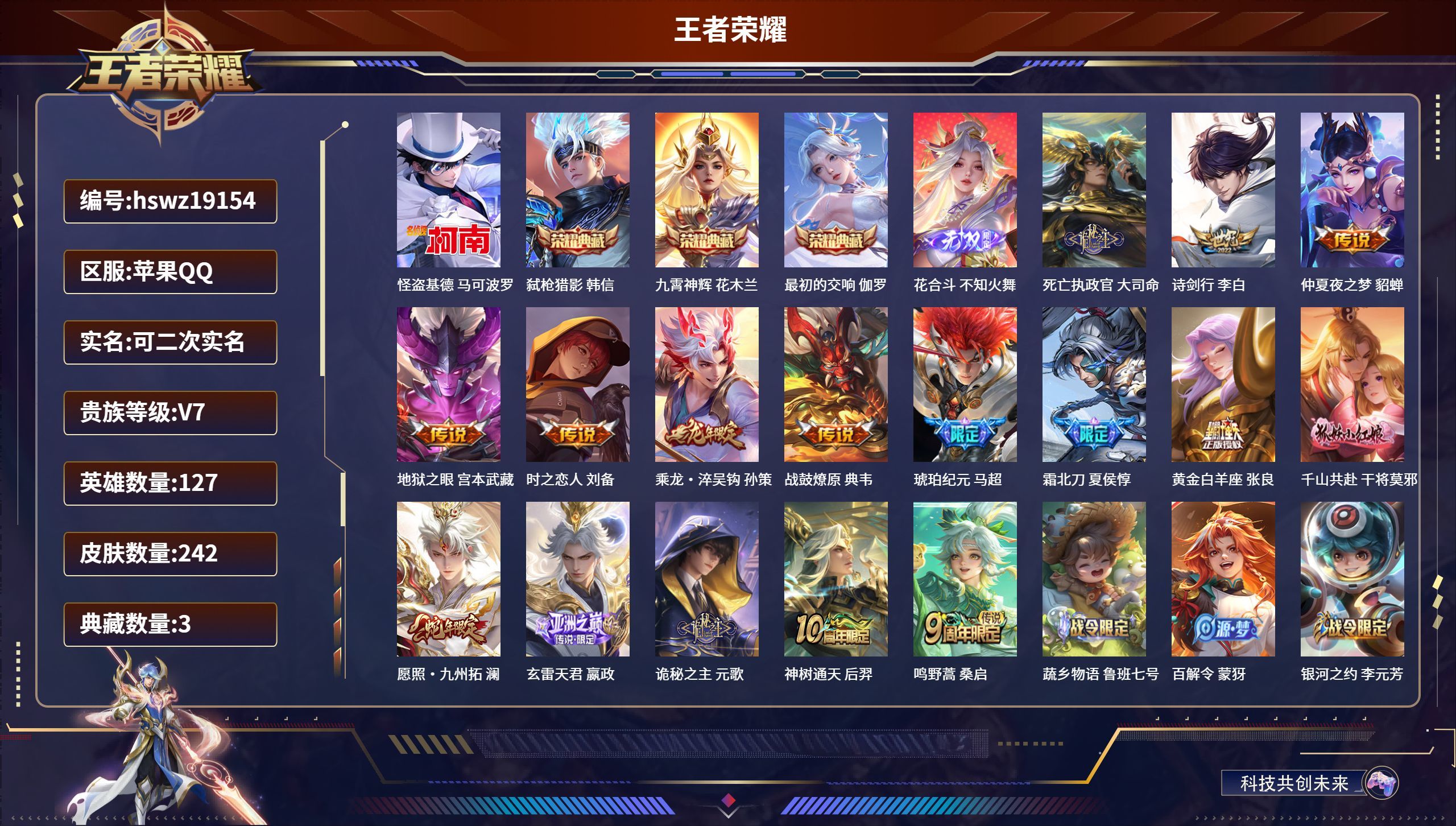 苹果QQ/非凡王者/242皮肤/127英雄/3典藏/0珍品无双/1无双/1珍品传说/16传说/88史