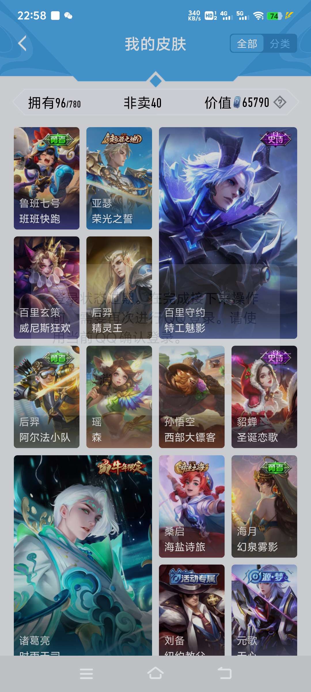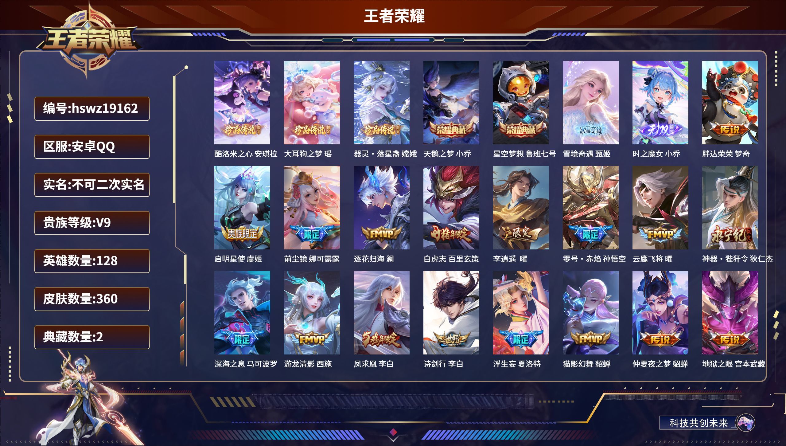 安卓QQ/无双王者/360皮肤/128英雄/2典藏/0珍品无双/2无双/3珍品传说/37传说/110