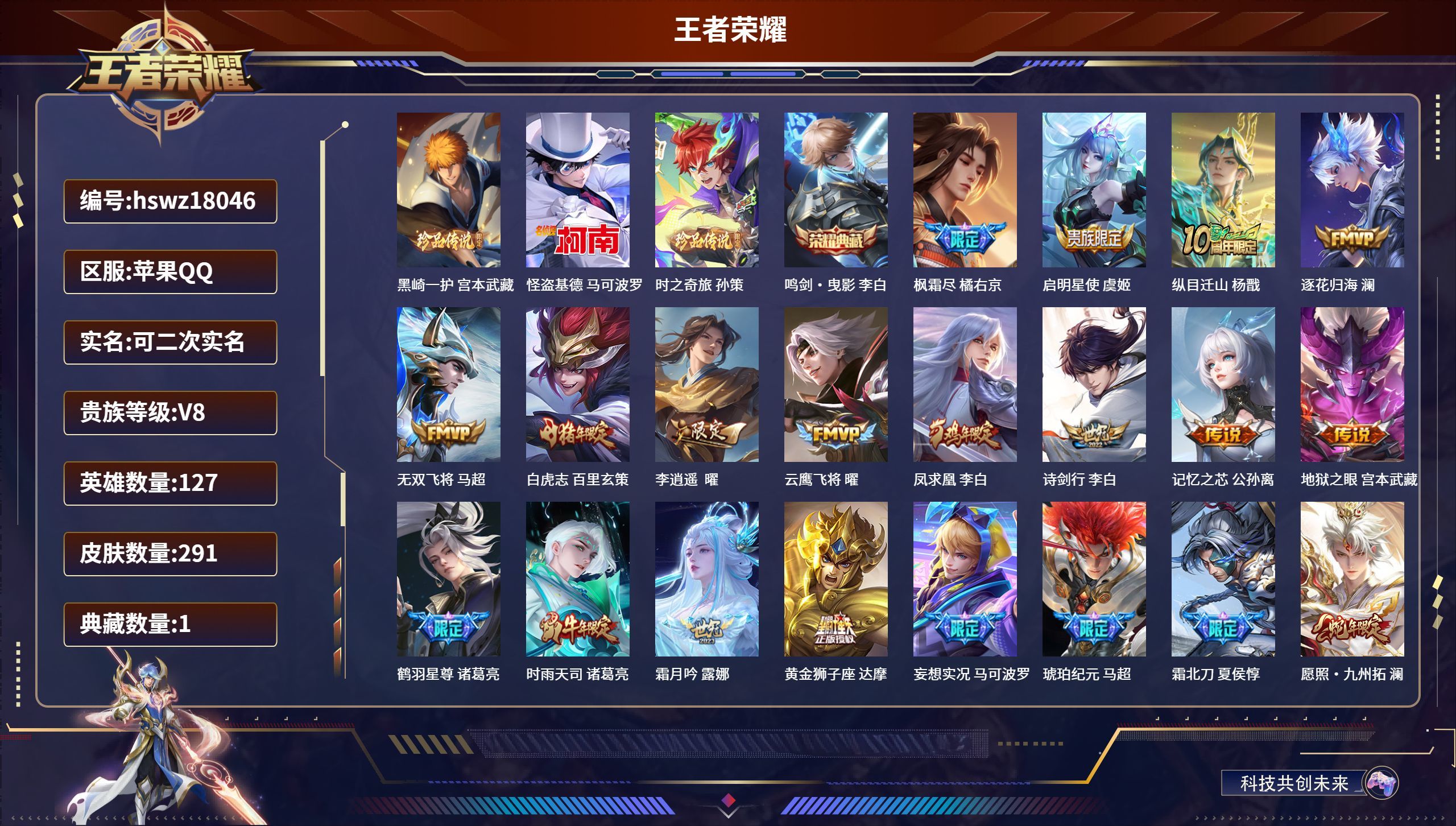 苹果QQ/最强王者/291皮肤/127英雄/1典藏/0珍品无双/0无双/3珍品传说/24传说/74史