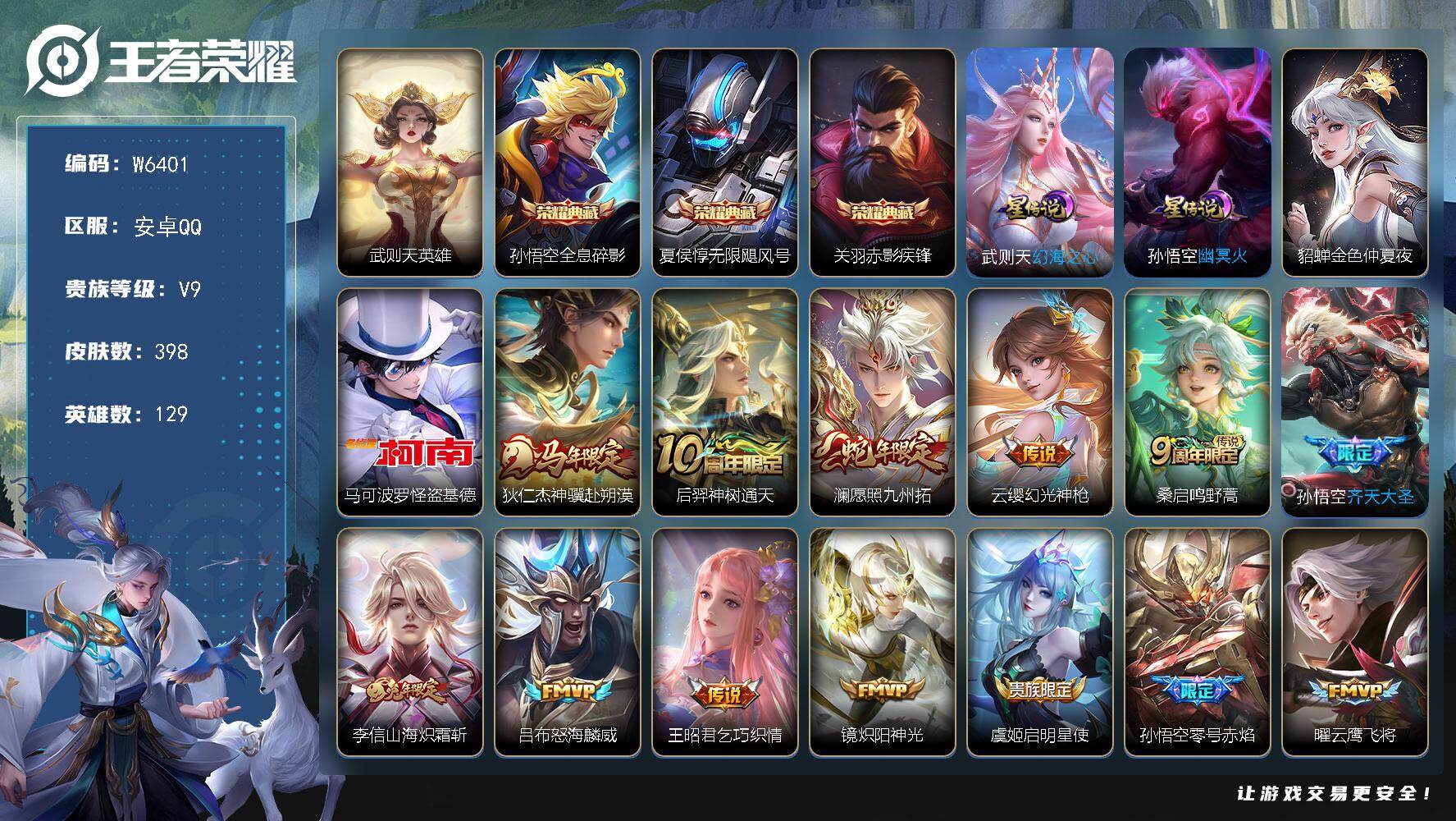 可二次-贵9-129英雄-398皮肤-4典藏(武则天)-1珍品传说-16传说-3星元-9按键-满铭文