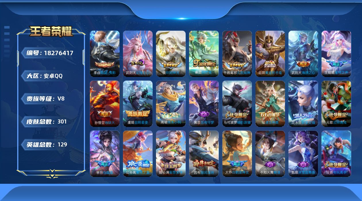 贵8-127英雄-263皮肤-1典藏-2星元-1无双-5珍品传说-13传说-93限定-1天幕-24按键-贵族积分53021