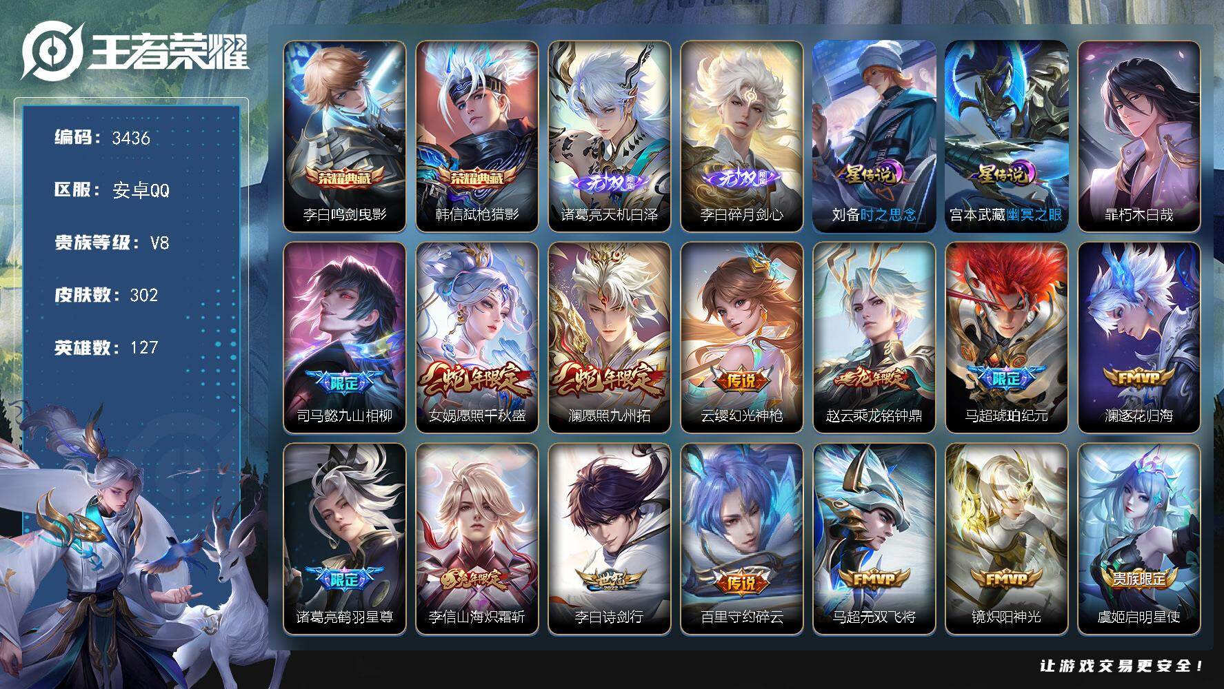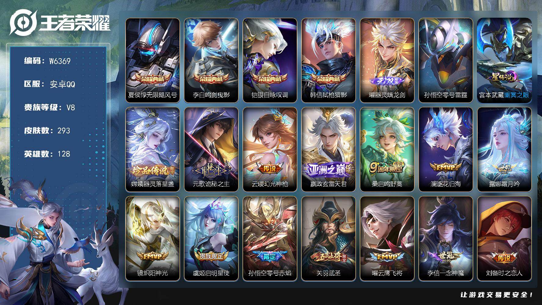 贵8-128英雄-293皮肤-4典藏-1无双-1珍品-1星元-16传说-17按键-贵族积分7.5w