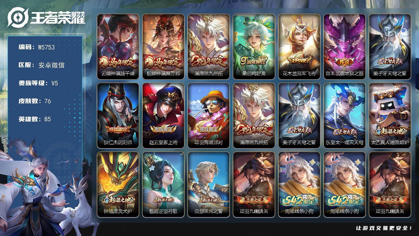 【秒换绑】安卓Q-V5-荣耀黄金I段位-87英雄-93皮肤-1典藏皮肤-1珍品