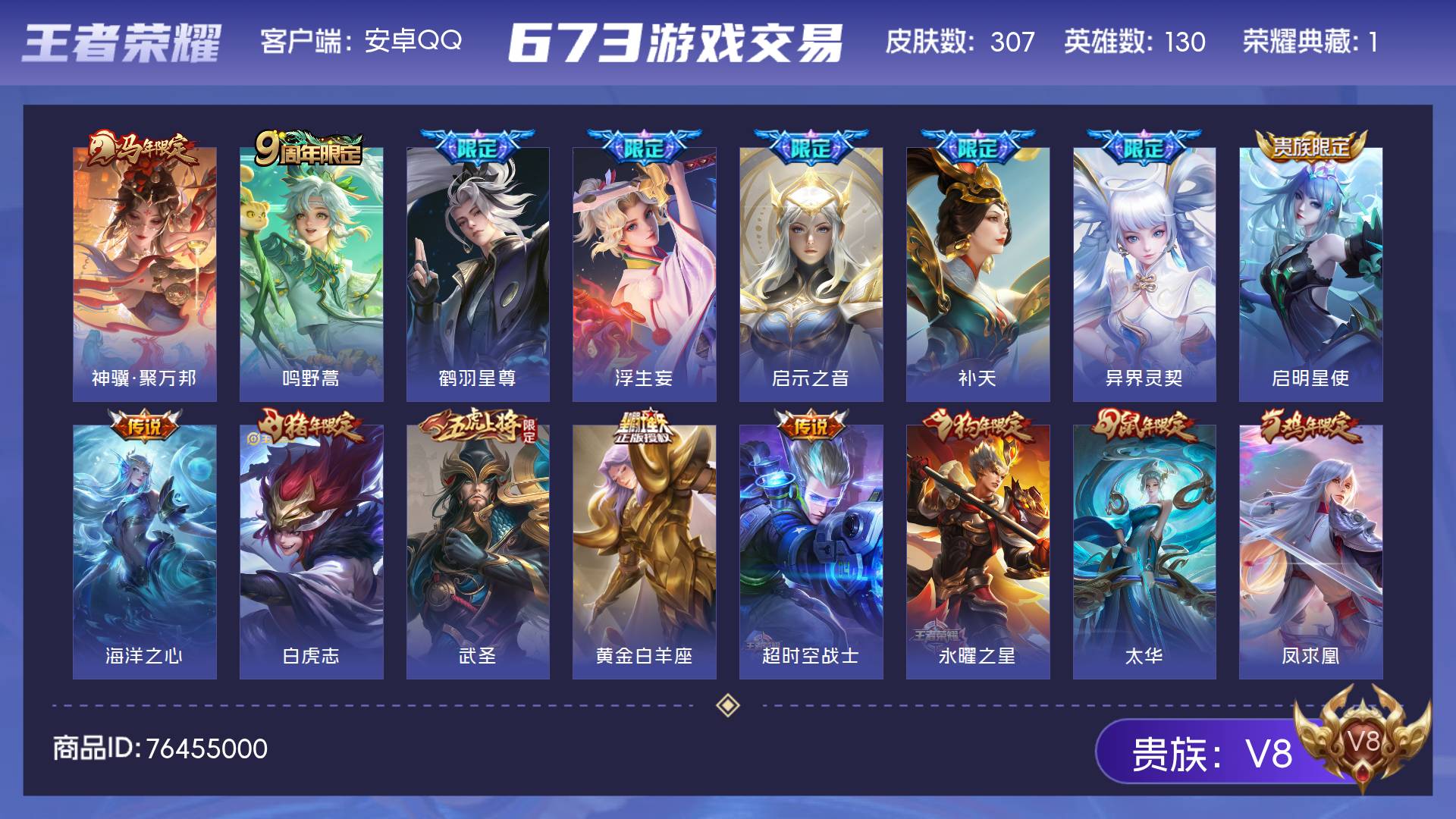 V8 皮肤307 英雄130 永恒钻石 荣耀典藏1 星传说3 传说22