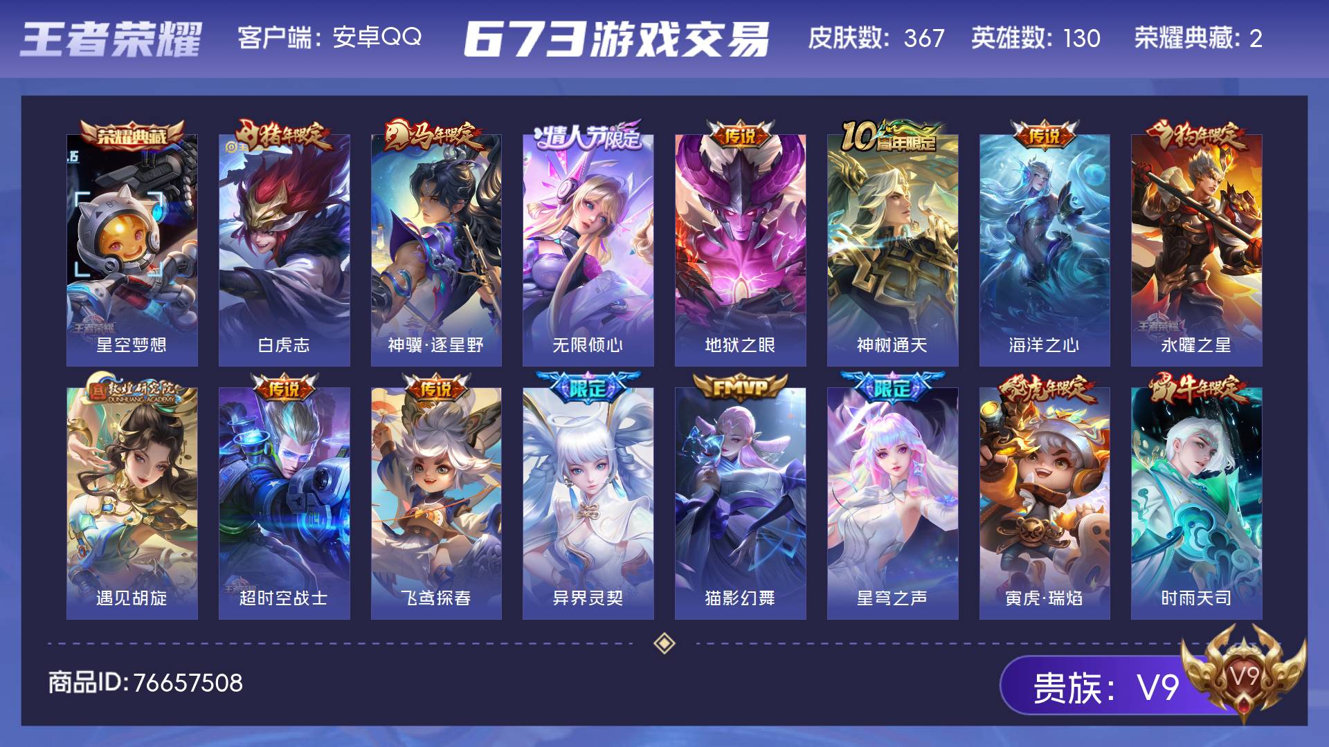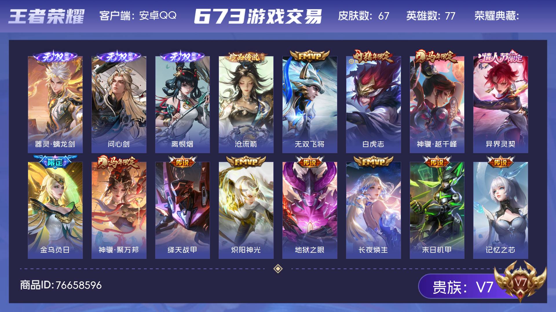 V7 皮肤67 英雄77 至尊星耀 无双皮肤3 珍品传说1 传说16