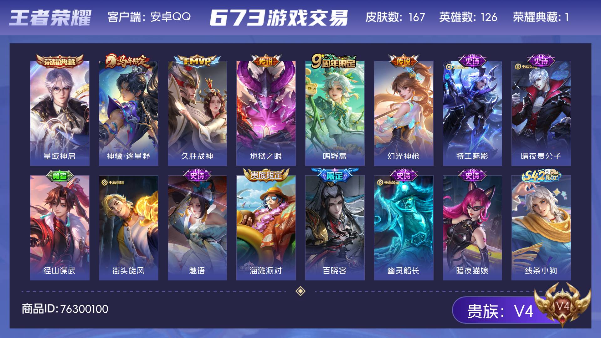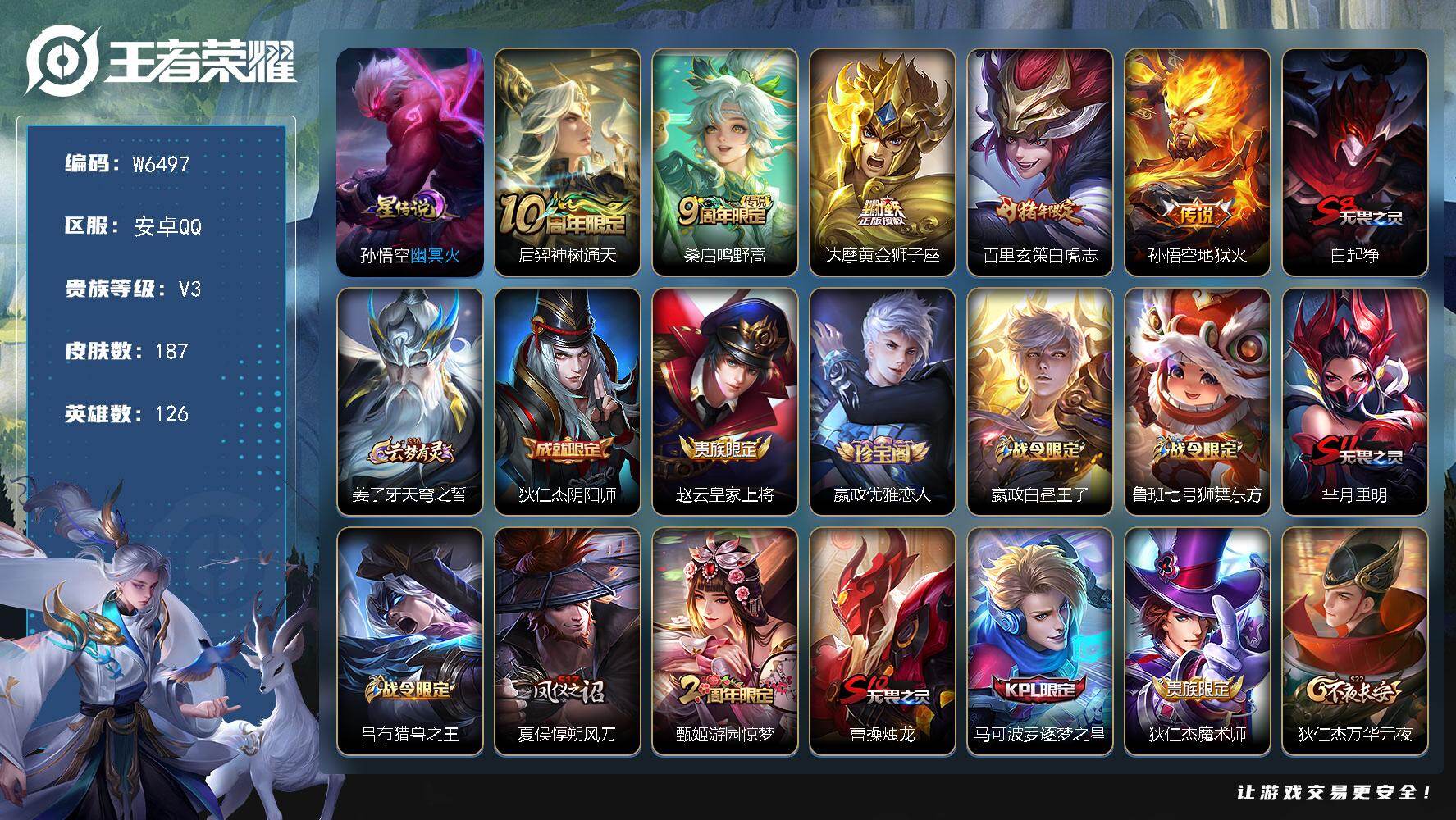 安卓Q-V3-永恒钻石III段位-127英雄-256皮肤-1典藏皮肤-15传说-