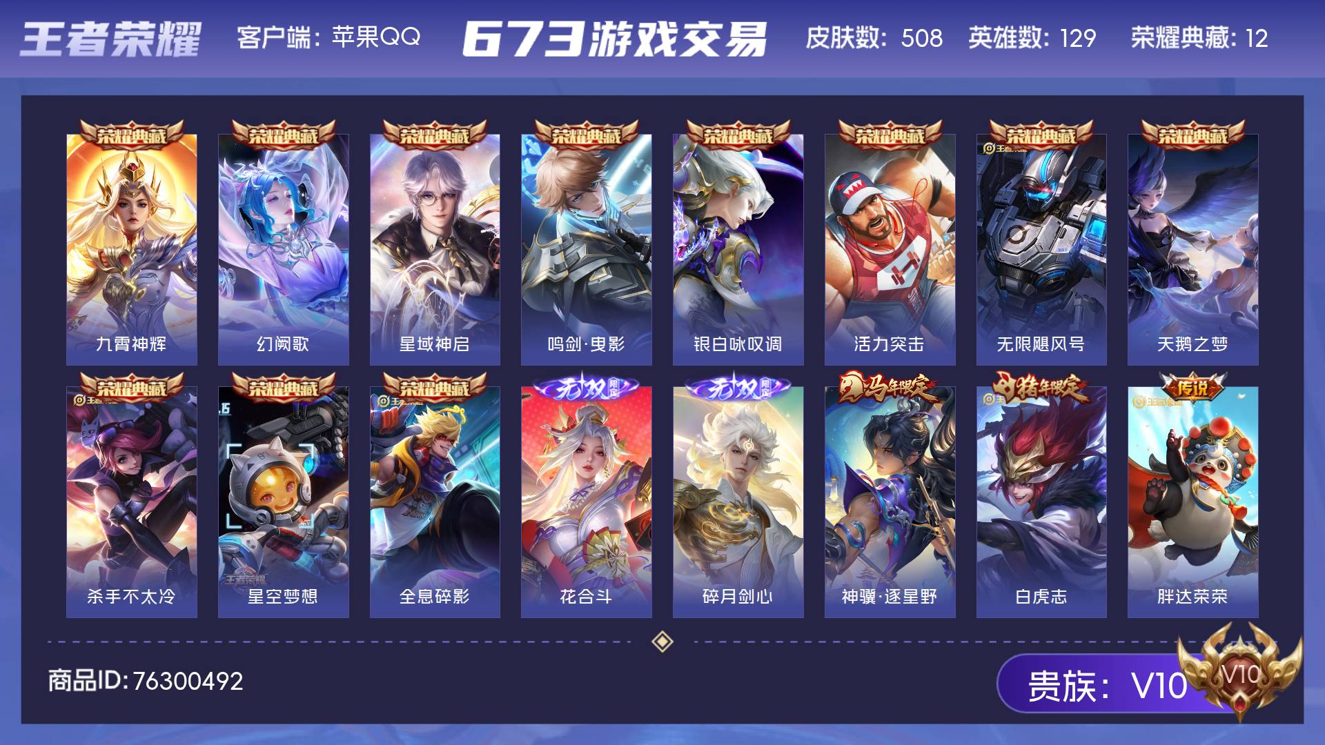 V10 皮肤508 英雄129 荣耀王者 荣耀典藏12 无双皮肤2 传说64