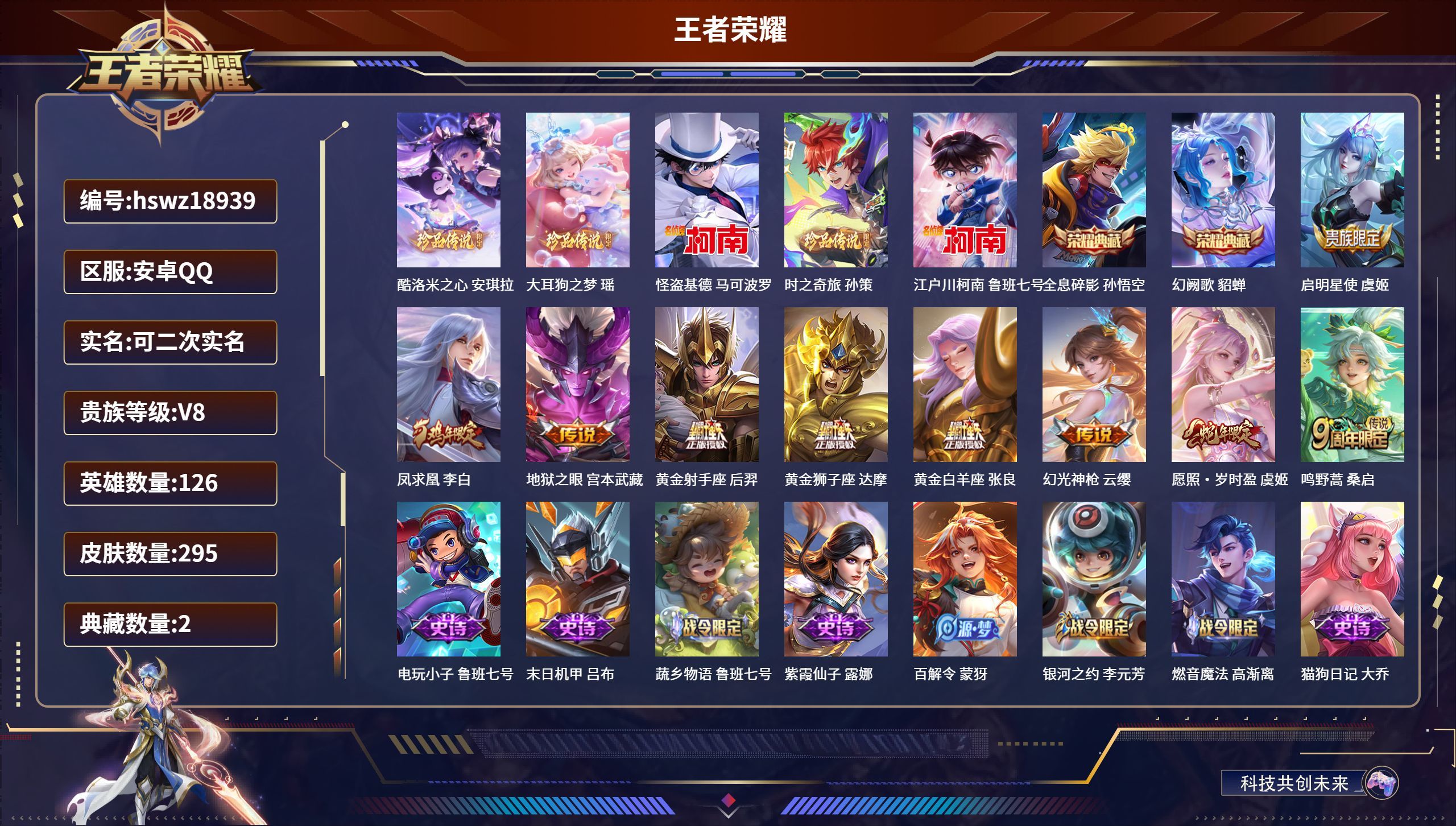 安卓QQ/非凡王者/295皮肤/126英雄/2典藏/0珍品无双/0无双/5珍品传说/9传说/76史诗