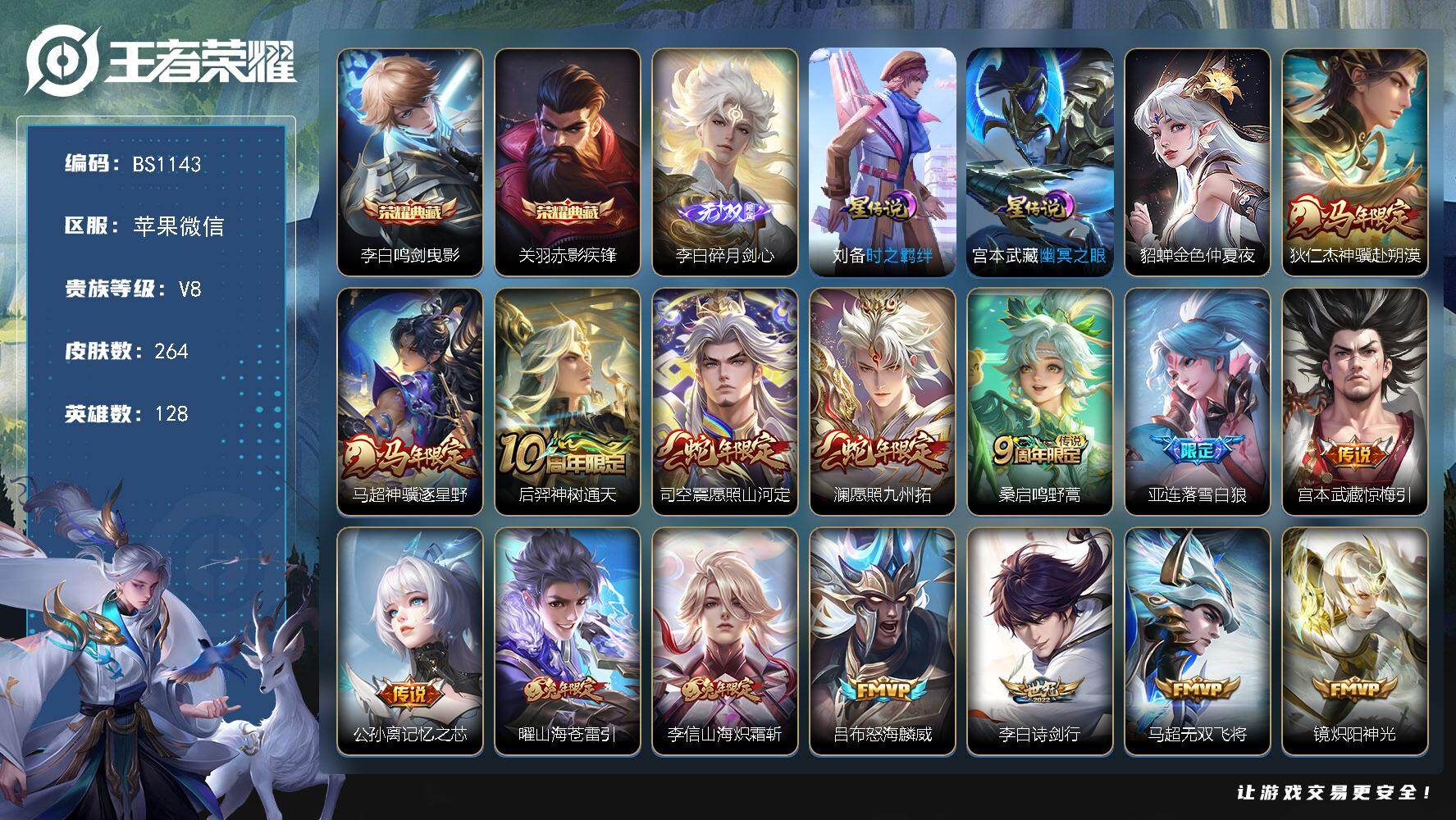V8-最强王者段位-128英雄-264皮肤-2典藏皮肤-1无双-21传说-86史诗