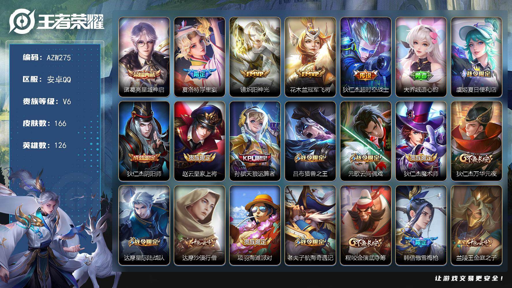 【AZW275】安卓Q-V6-最强王者段位-126英雄-166皮肤-1典藏皮肤