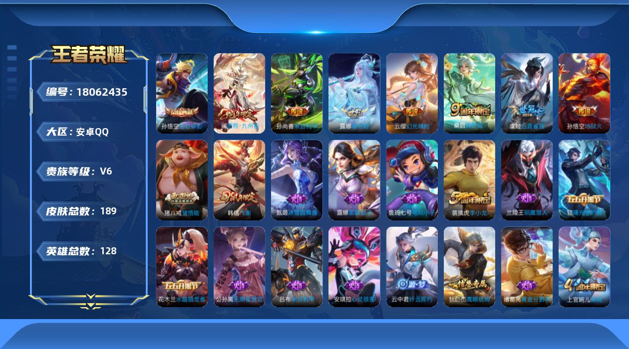 实名: 可修改 贵族等级: V6 英雄数: 119 皮肤数: 129 珍品传说