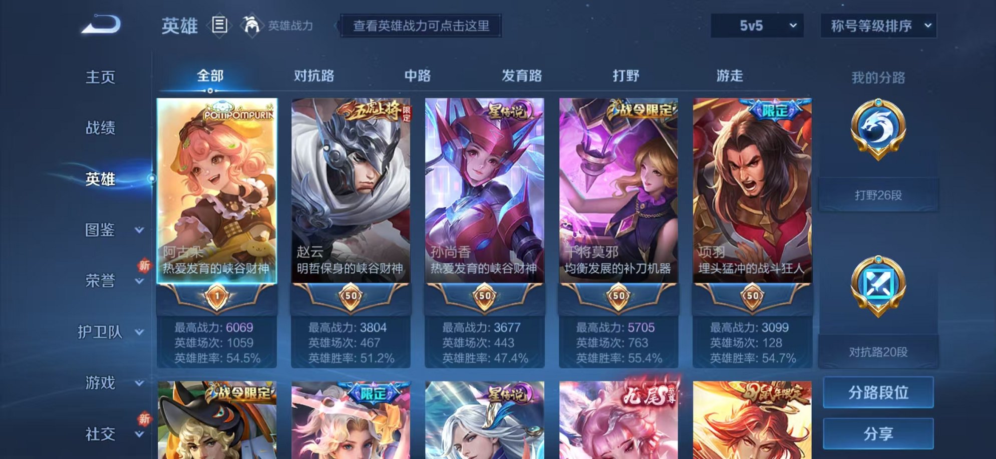 贵族等级: V5 英雄数: 126 皮肤数: 138 星传说: 幽冥火 传说皮