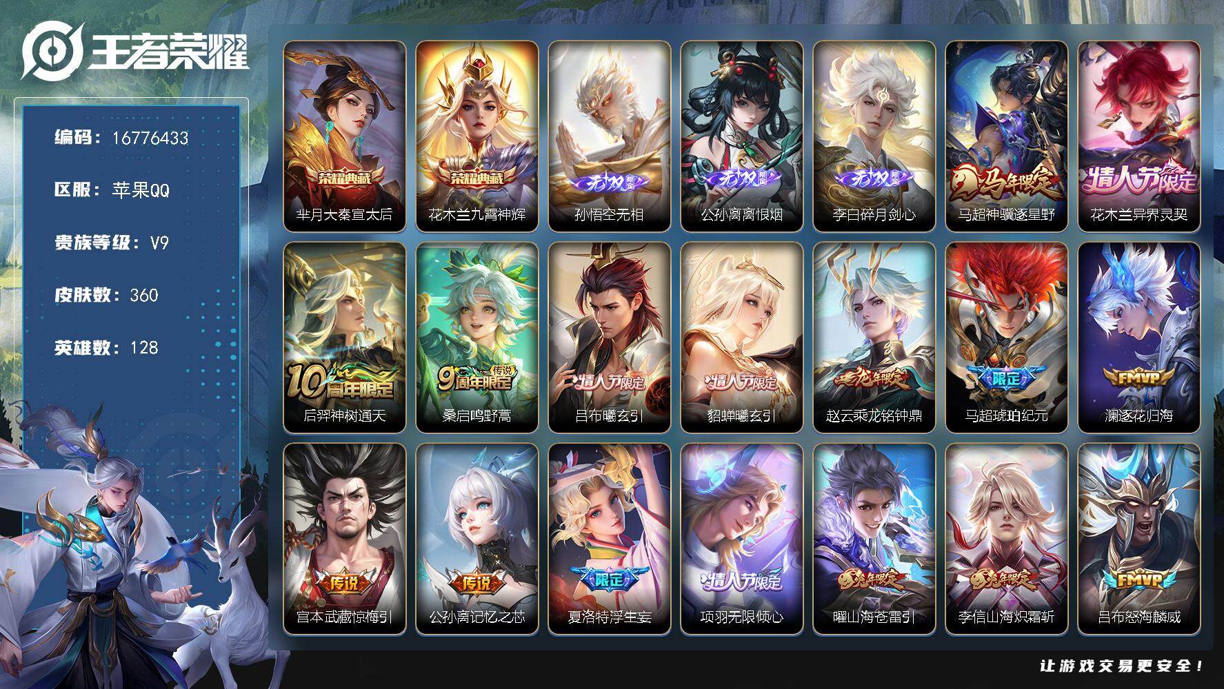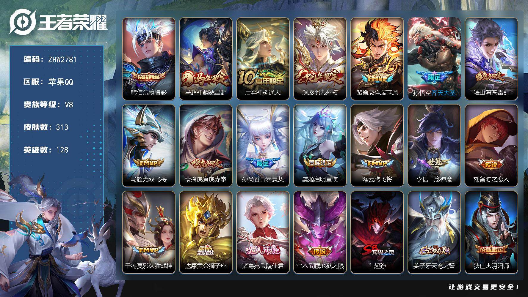 苹果QQ/永恒钻石/293皮肤/128英雄/2典藏/0珍品无双/0无双/1珍品传说/27传说/87史