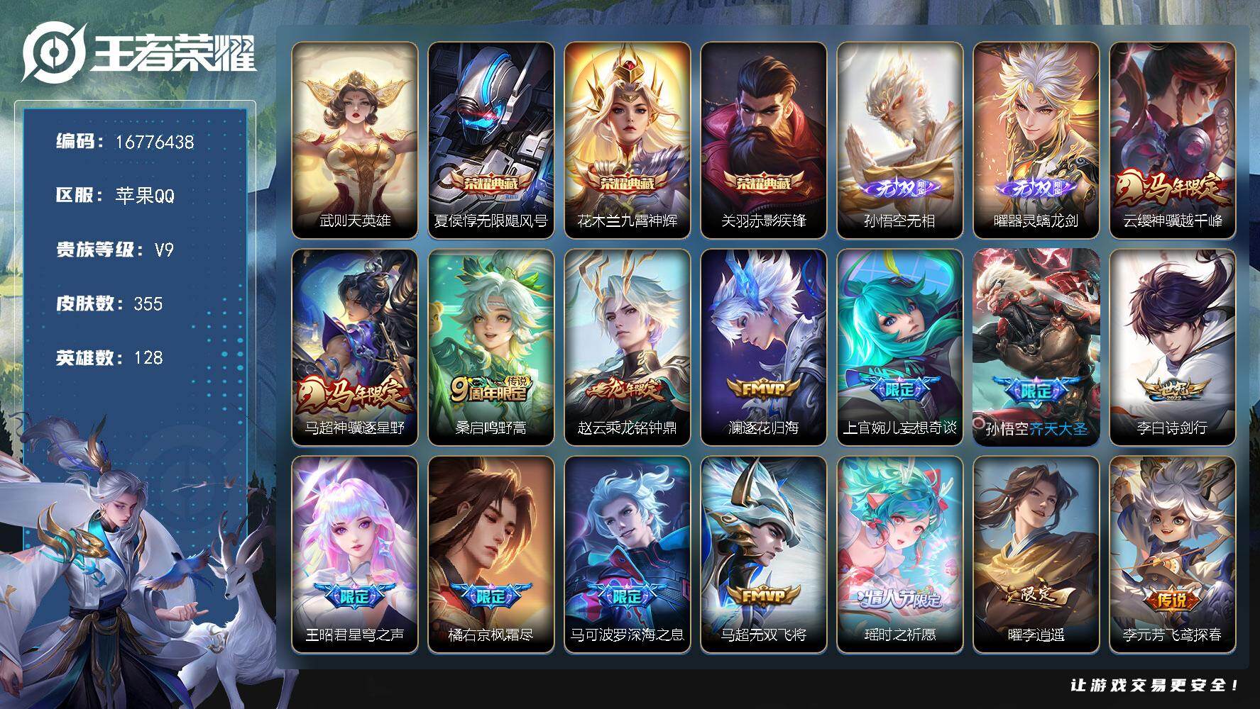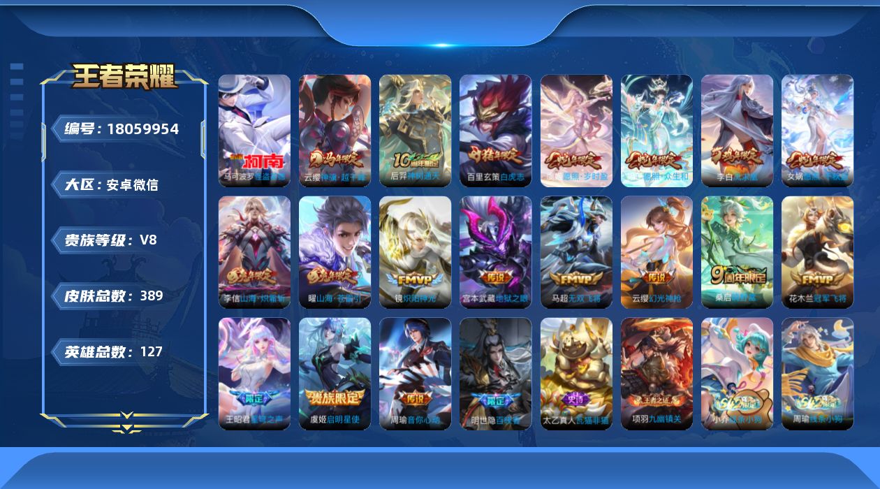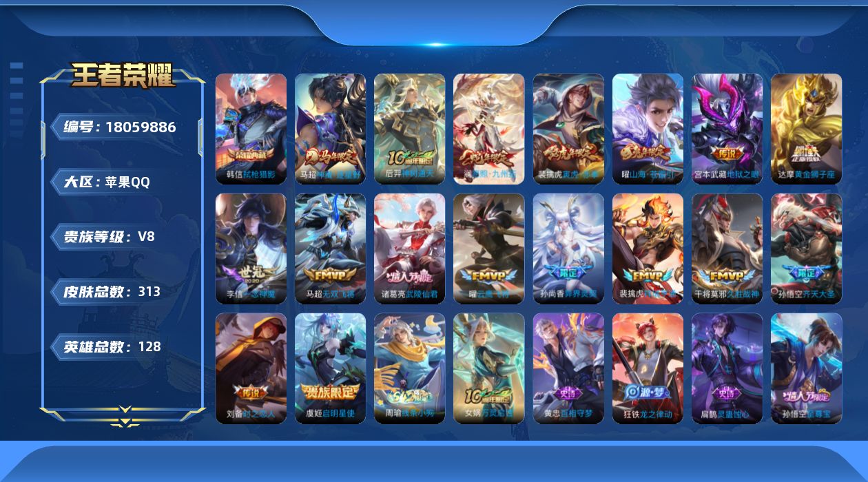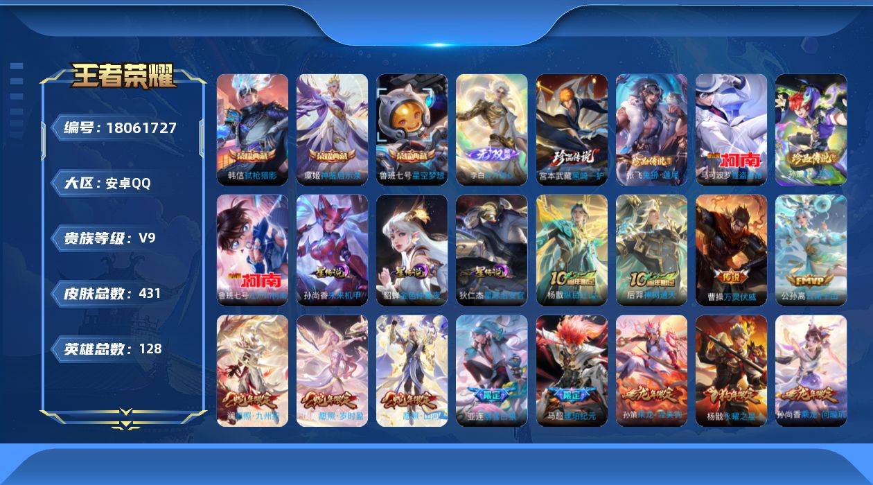 安卓QQ/荣耀王者/418皮肤/128英雄/4典藏/0珍品无双/0无双/2珍品传说/22传说/125