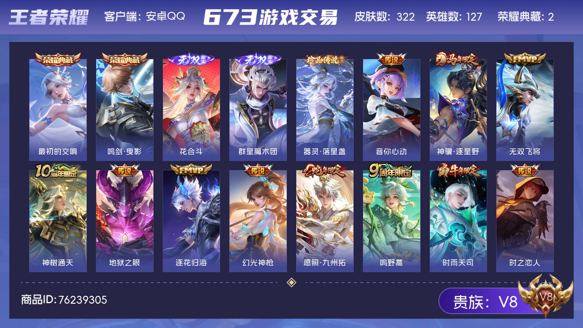 V8 皮肤322 英雄127 非凡王者 荣耀典藏2 无双皮肤2 珍品传说1 星传说3 传说32