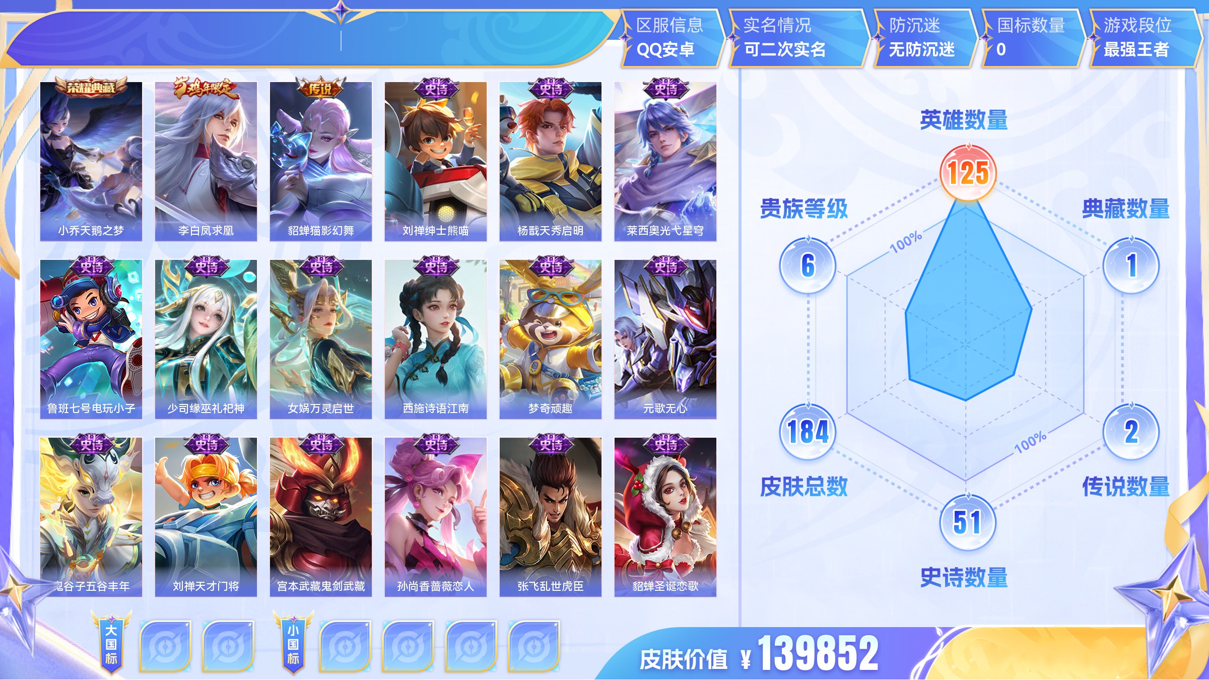 传说5 史诗30 限定38 英雄125 皮肤129