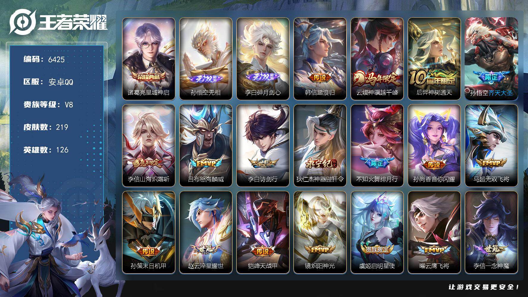 贵族8/皮肤281/典藏1/传说17/史诗82/英雄128/刘禅全皮/李信全皮/