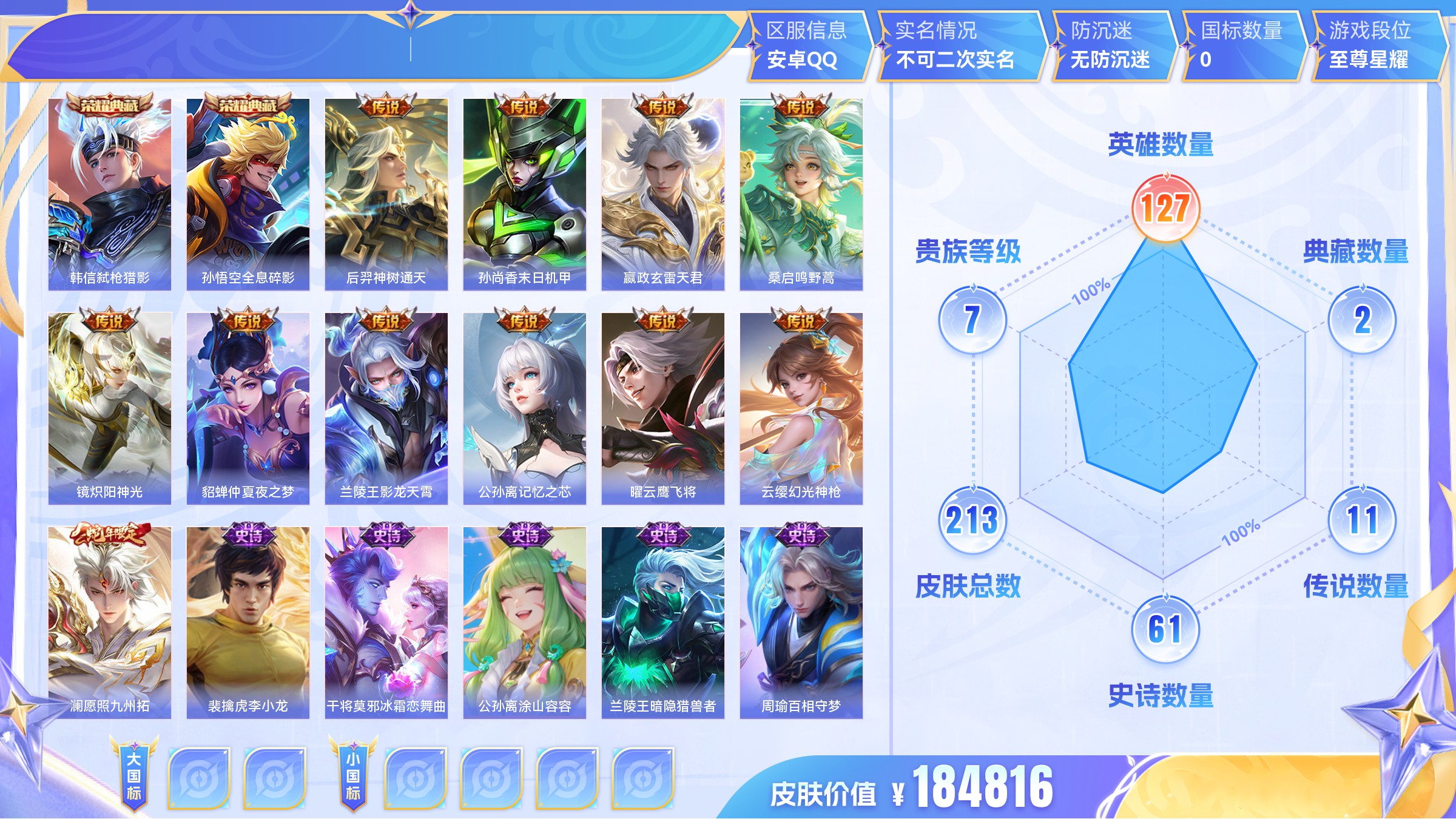 典藏1 传说11 史诗80 限定86 英雄127 皮肤2