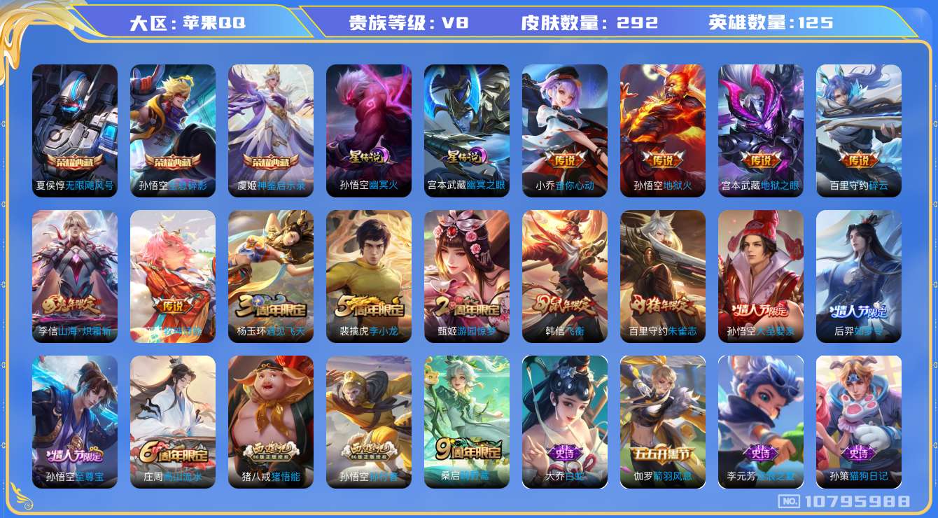 苹果Q-V8-最强王者段位-127英雄-389皮肤-2典藏-0珍品无双-2无双-2珍品传说-23传说