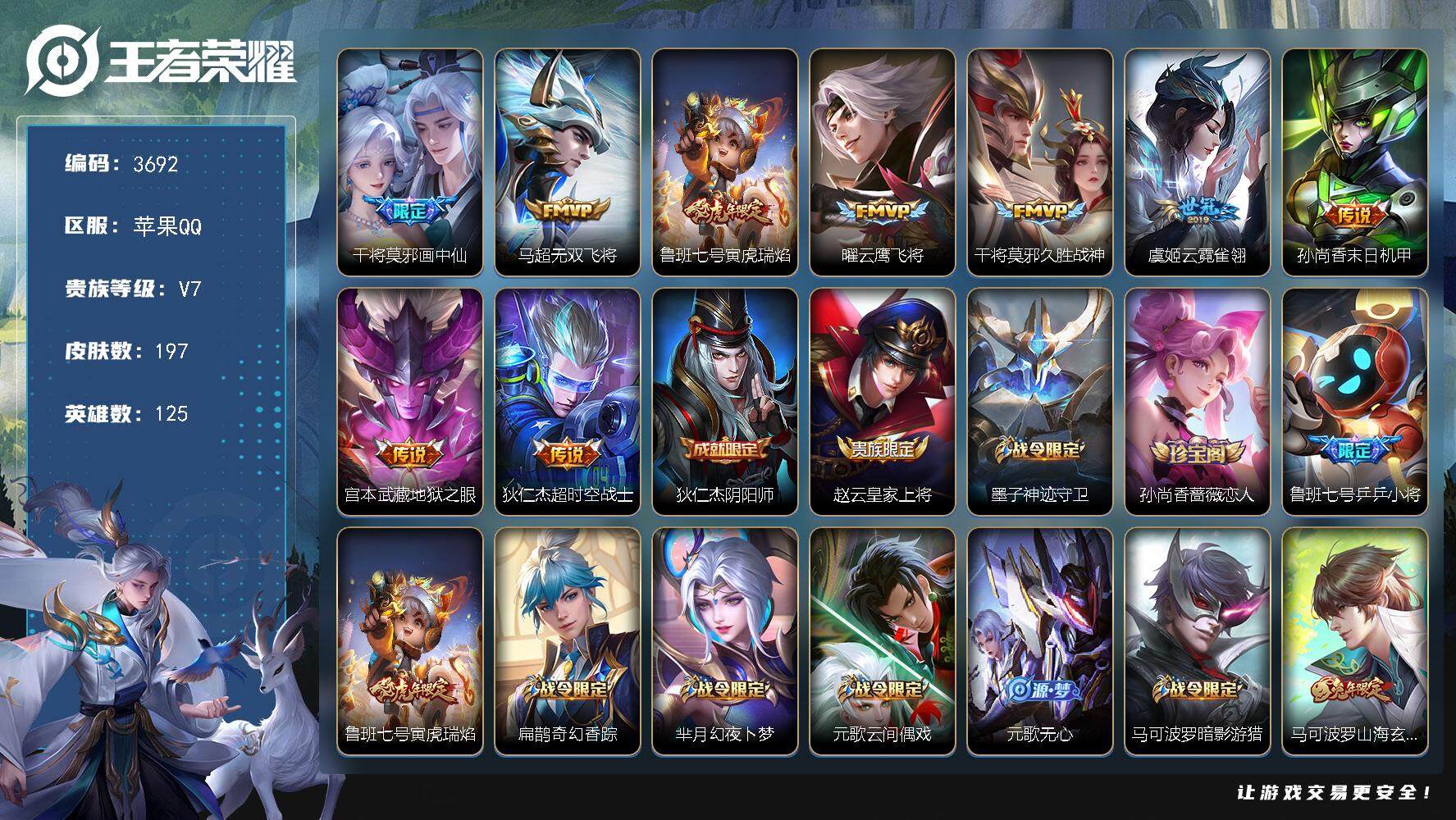 苹果Q-V0-最强王者段位-125英雄-197皮肤-9传说-66史诗【传说皮