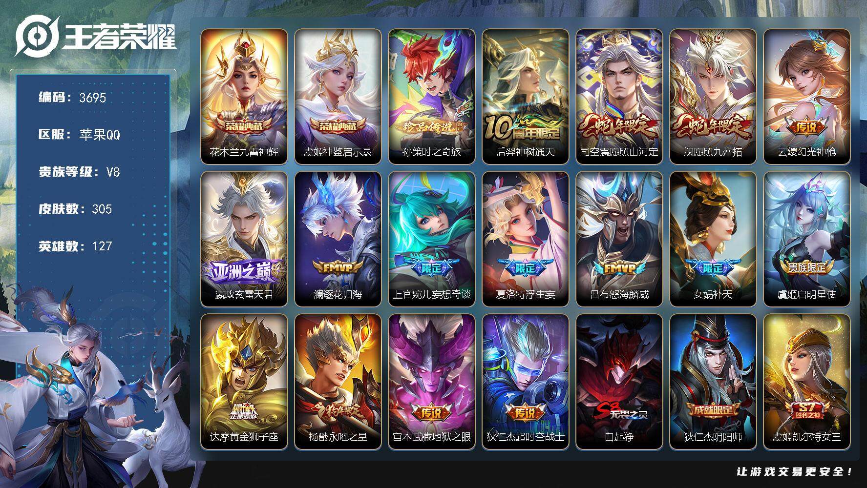 苹果Q-V7-最强王者段位-127英雄-305皮肤-2典藏皮肤-1珍品传说-1