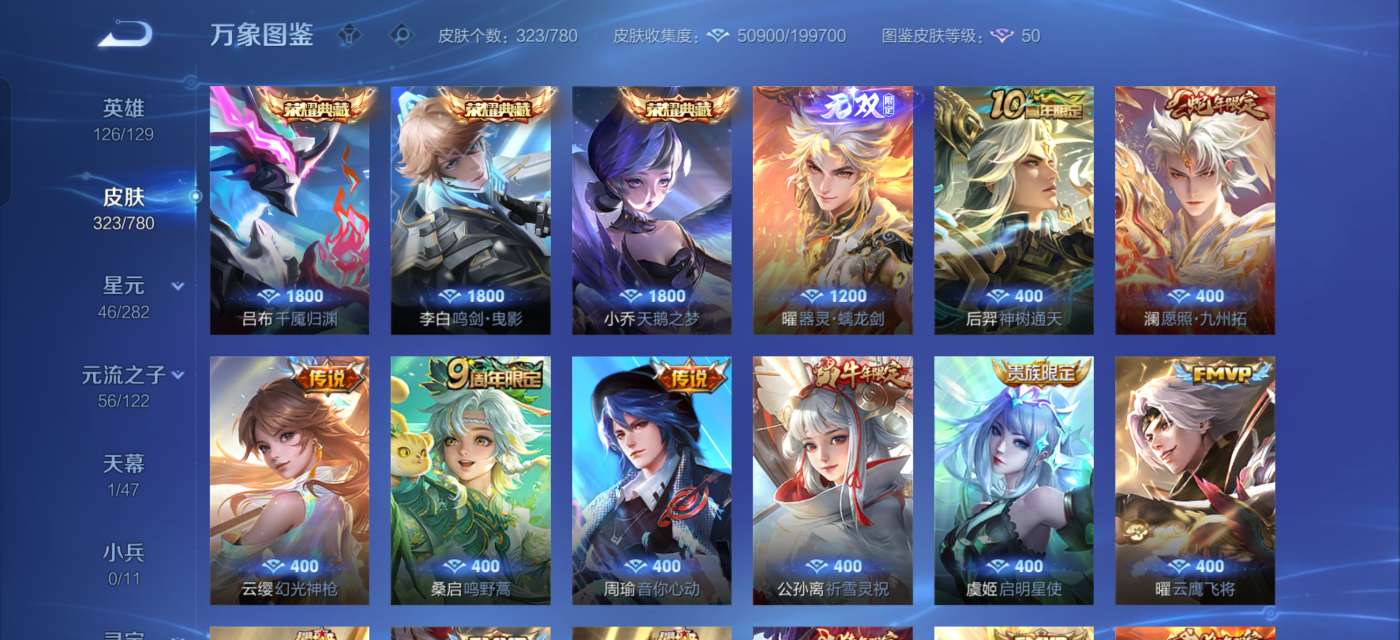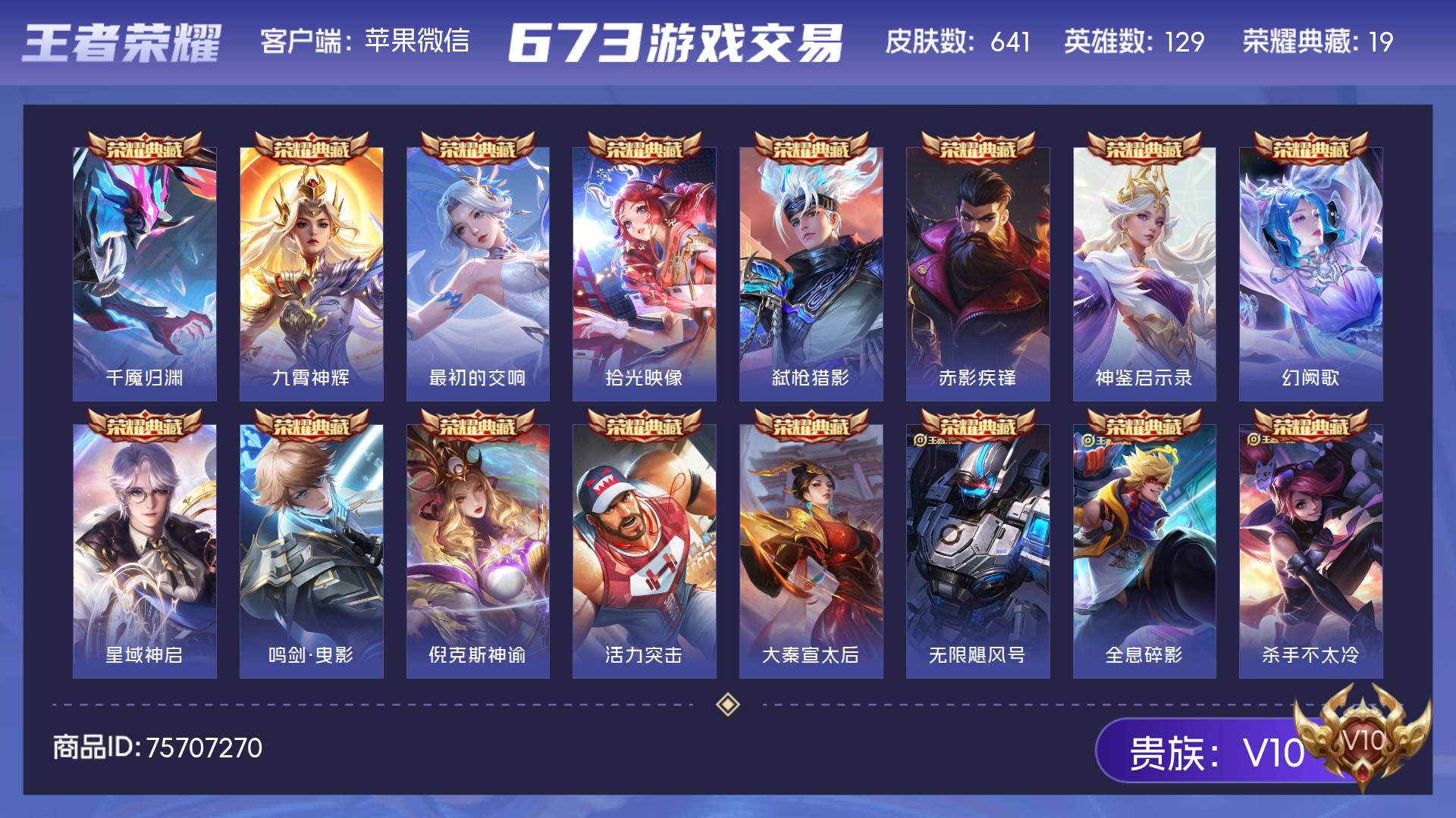 V10 皮肤641 英雄129 至圣王者 荣耀典藏19 无双皮肤8 珍品传说6 传说81 其他皮肤528