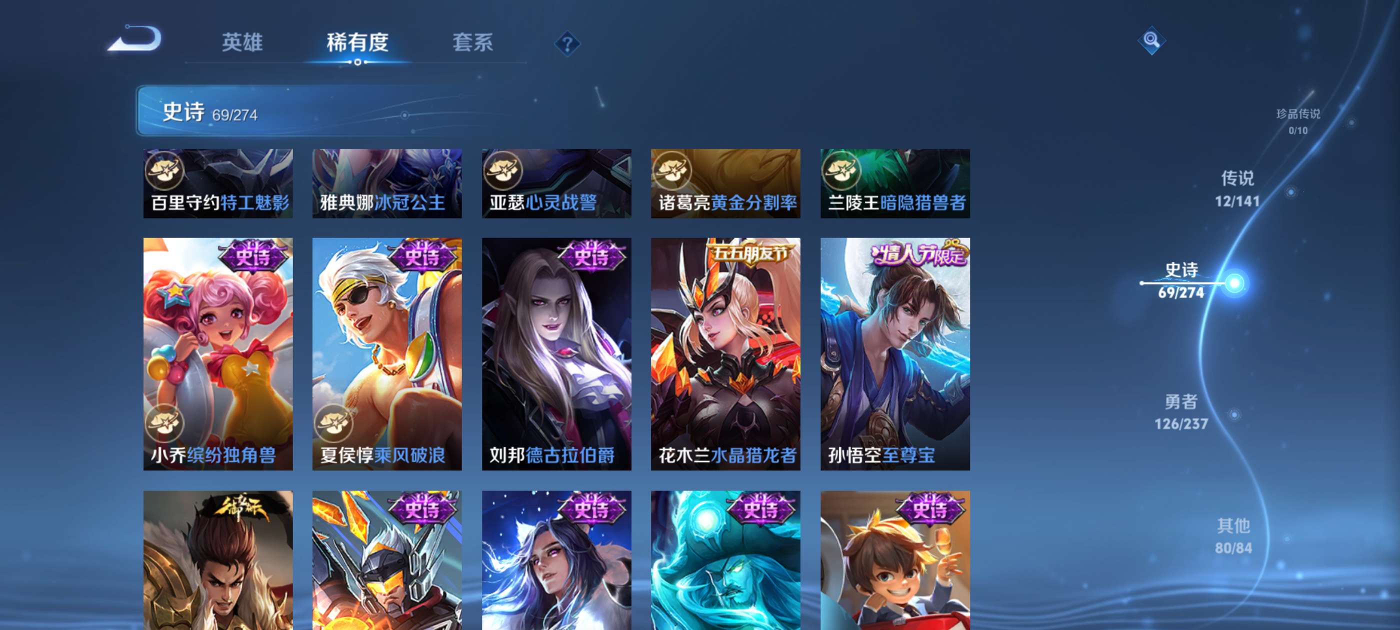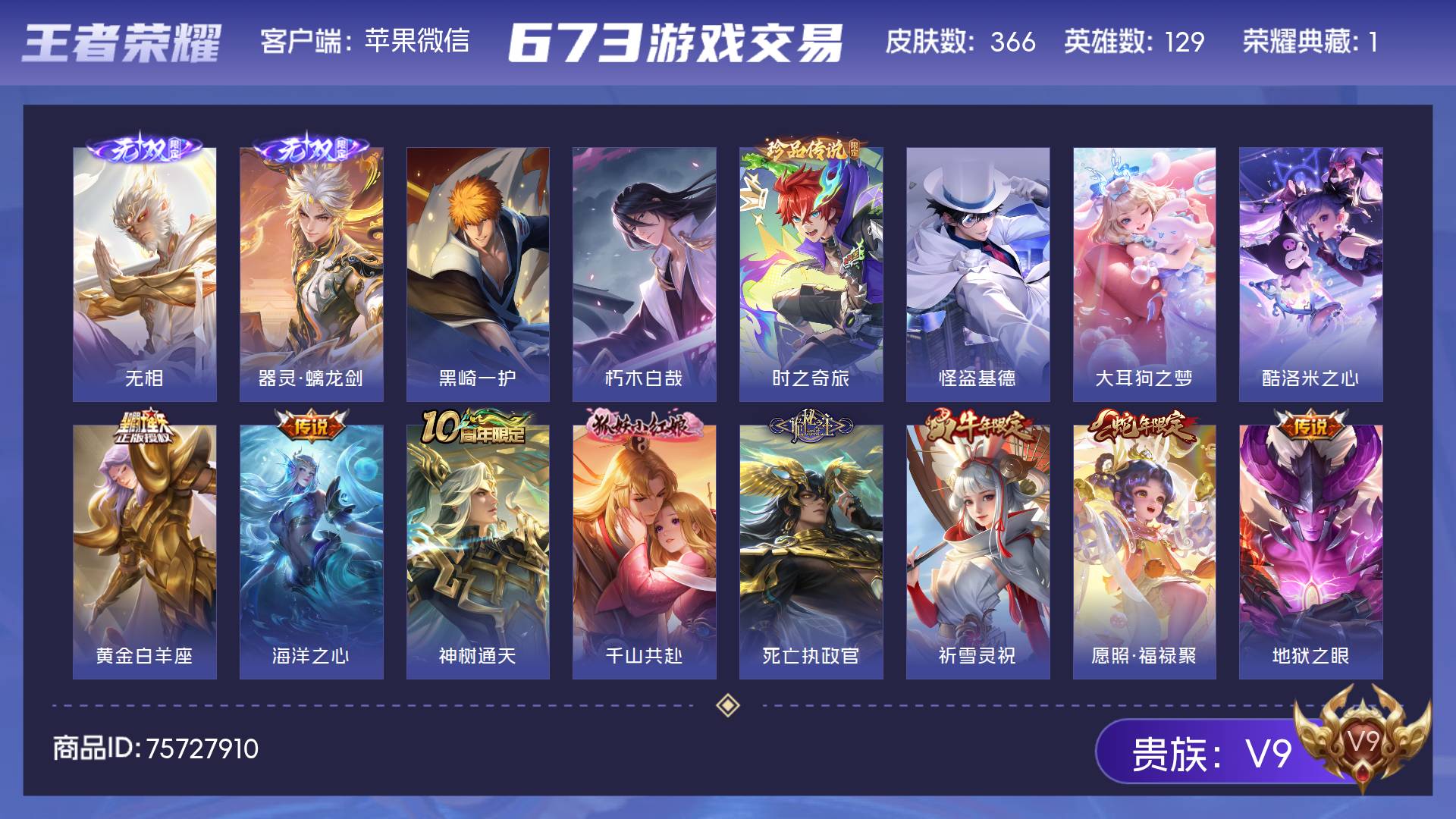 V9 皮肤366 英雄129 荣耀王者 荣耀典藏1 无双皮肤2 珍品传说6 传说27 其他皮肤331
