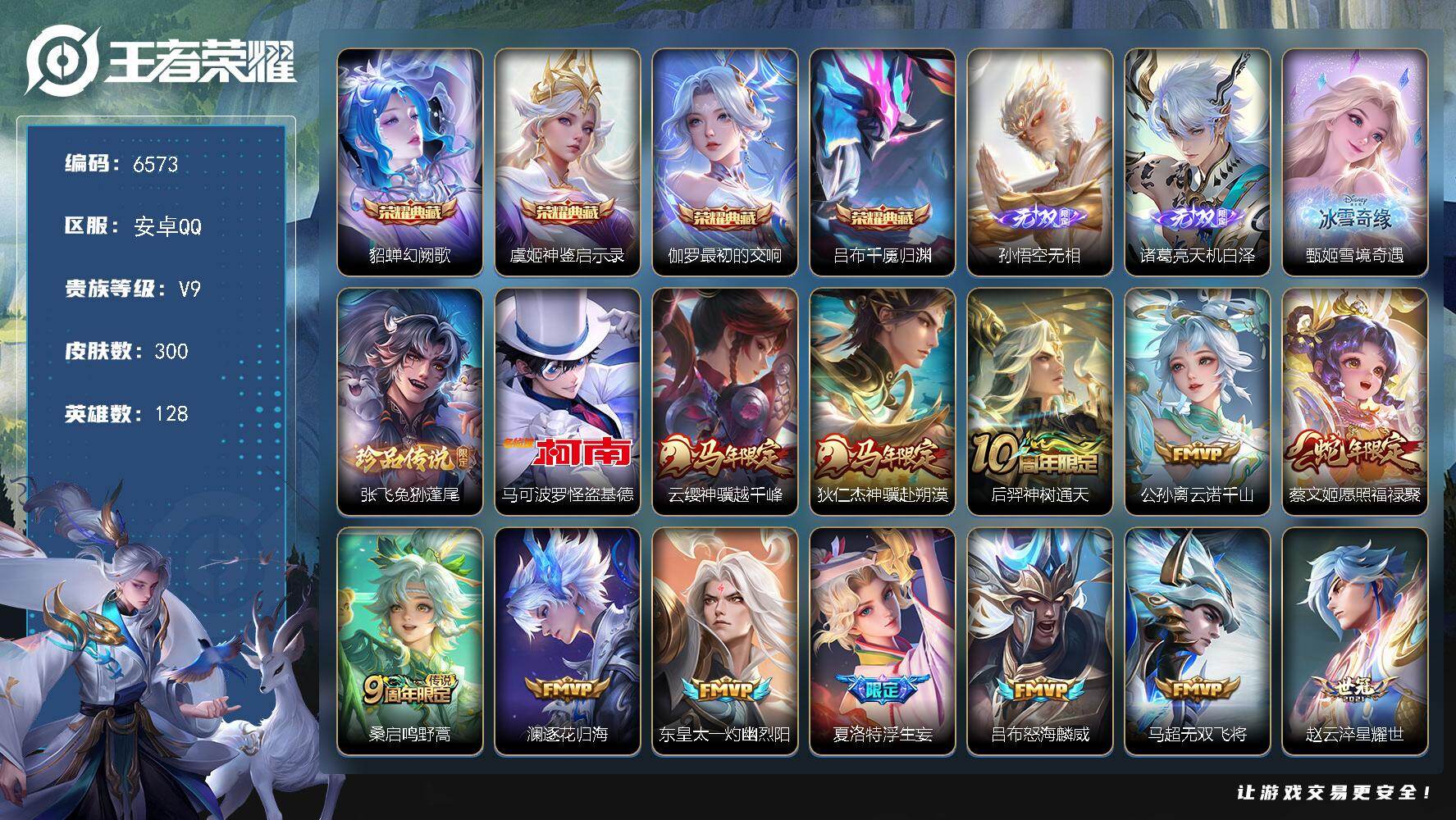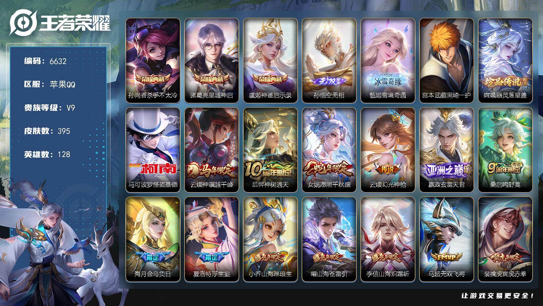 苹果Q-V9-最强王者段位-128英雄-390皮肤-5典藏皮肤-3无双-32传