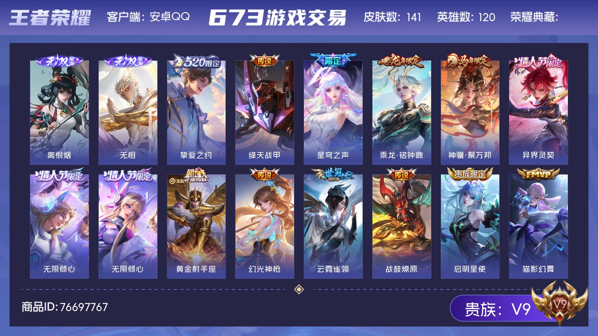 V9 皮肤141 英雄120 至尊星耀 无双皮肤2 星传说1 传说23
