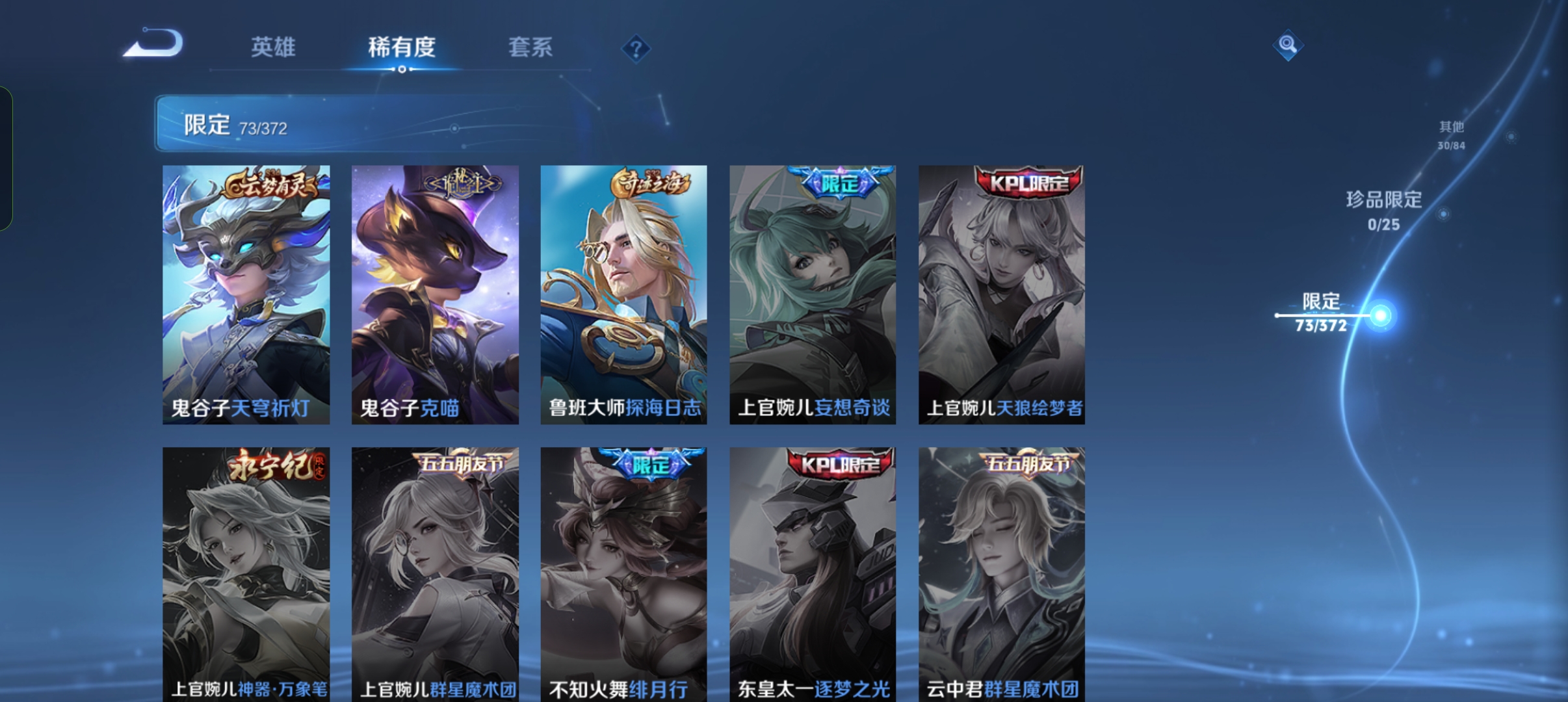 贵族等级7/荣耀典藏数量3/传说皮肤数量9/史诗皮肤数量58