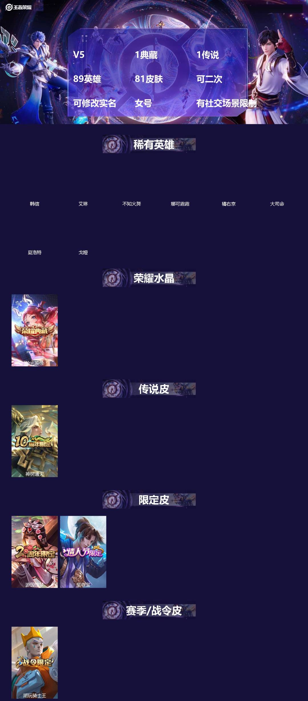 V5 1典藏 1传说 89英雄 81皮肤 可二次 可修改实名 女号 有社交场景限