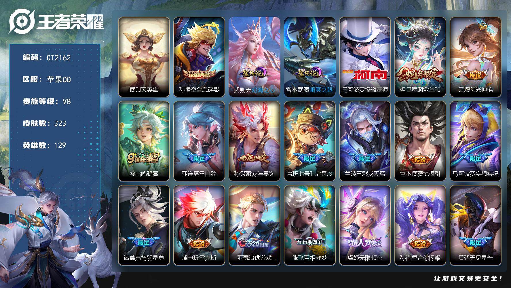 苹果QQ-1典藏-2传说-201皮肤-125英雄-无双王者-QQ区苹果 安卓区也有皮肤 不想玩了,急出