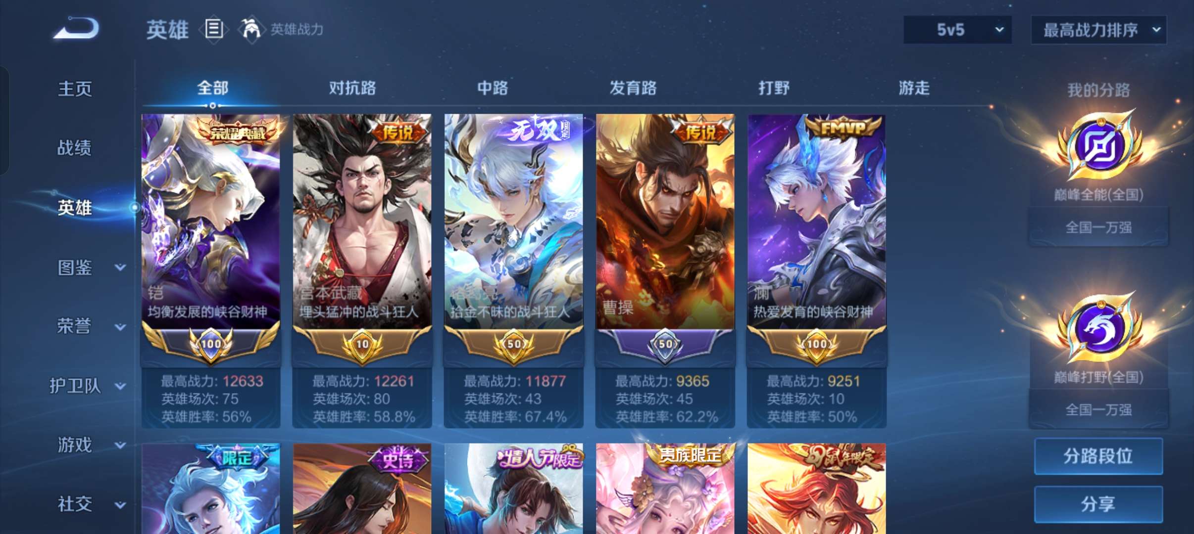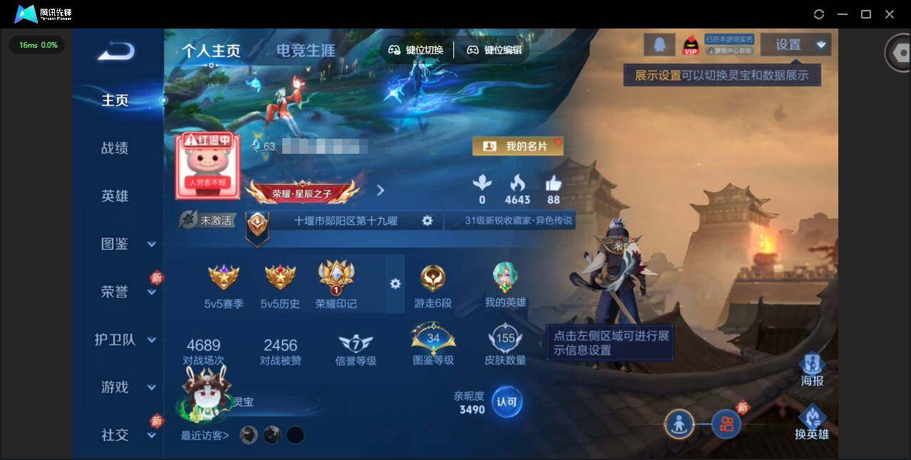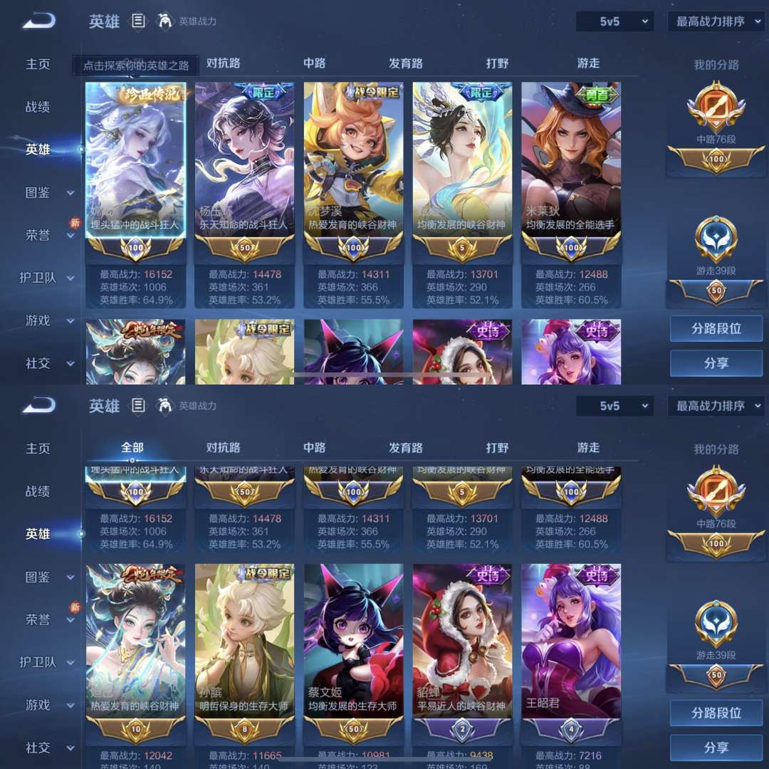 实名: 可修改 贵族等级: V5 英雄数: 119 皮肤数: 155 传说皮: