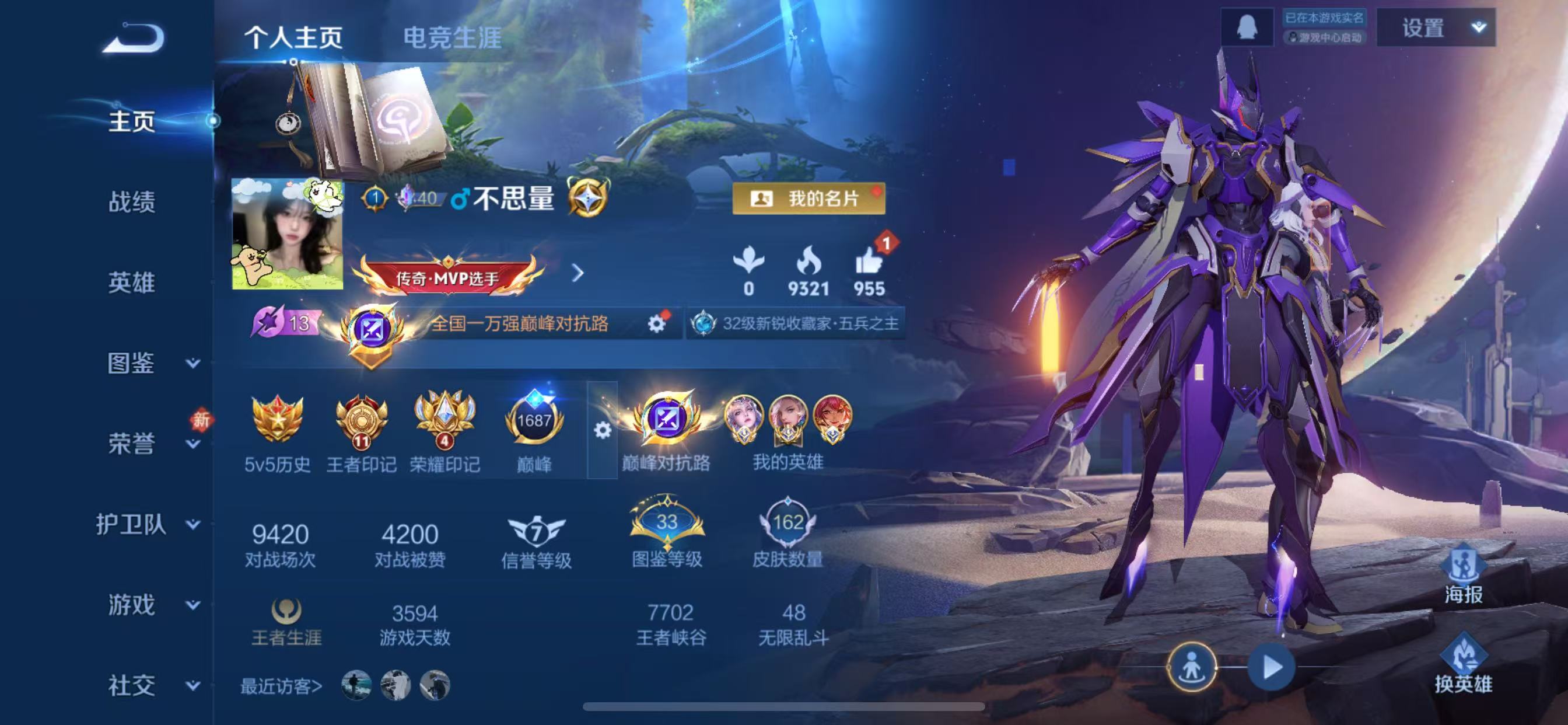 贵族等级: V7 英雄数: 117 皮肤数: 114 荣耀水晶: 星域神启 传