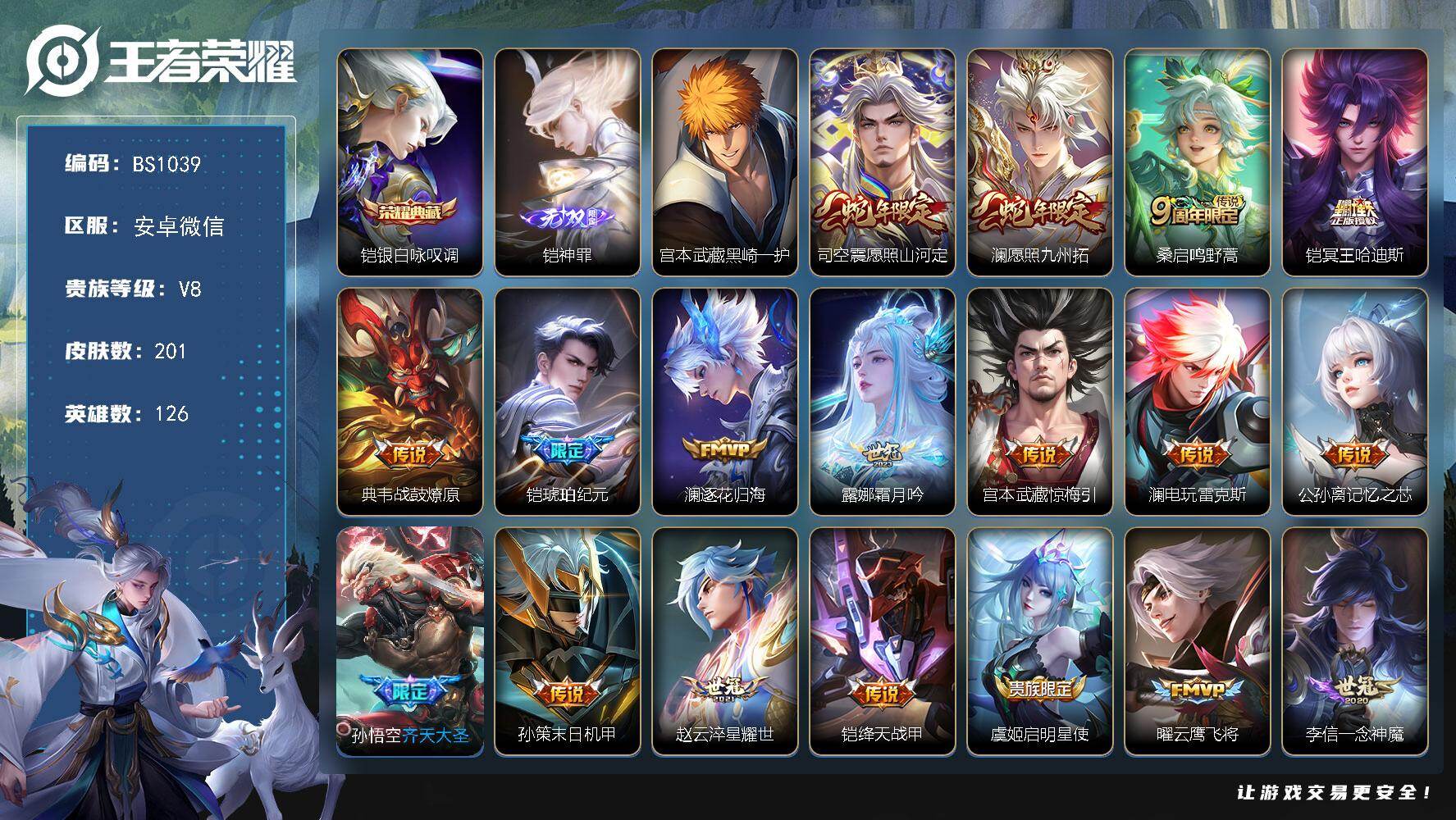 安卓WX-V8-至尊星耀III段位-126英雄-201皮肤-1典藏皮肤-1无双