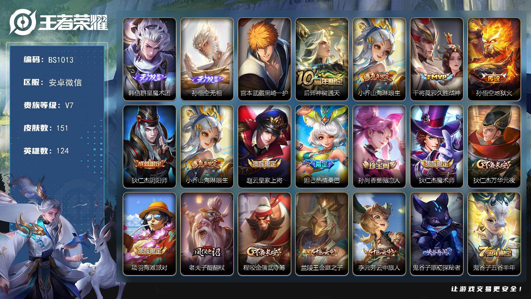 安卓WX-V7-最强王者段位-124英雄-151皮肤-2无双-1珍品传说-4传