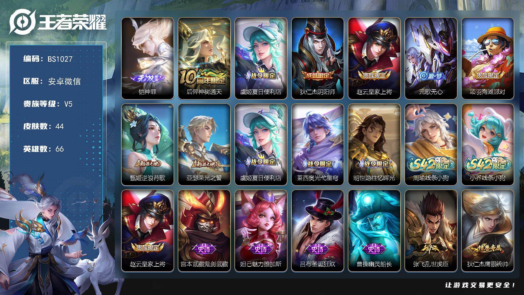 精品小号! 金标元流之子 安卓WX-V5-最强王者段位-66英雄-44皮肤-1